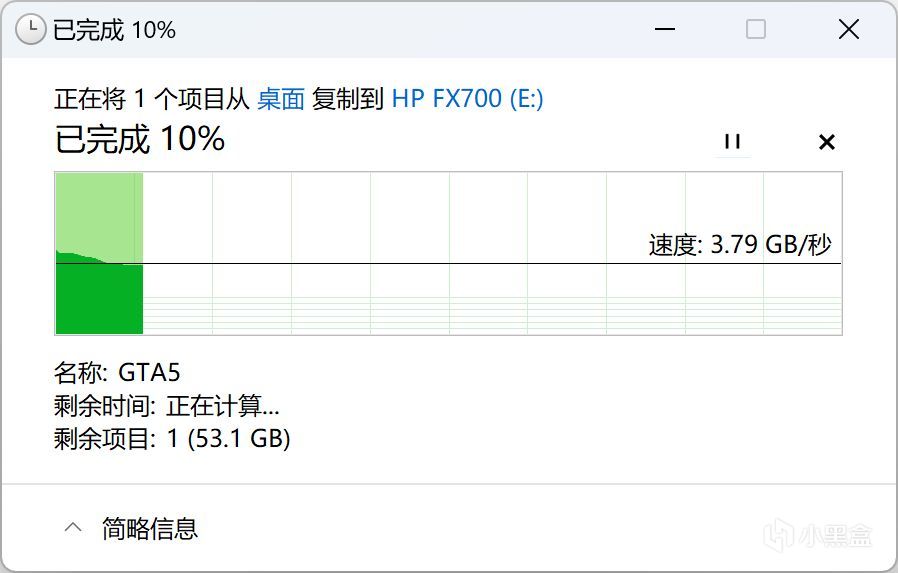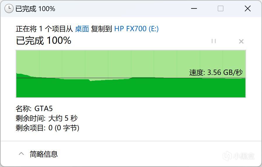 测试拷贝一个GTA5的文件压缩包,压缩包大概为85GB左右,实测从桌面复制到HP FX700固态盘传输速度稳定在:3.56 GB/秒。