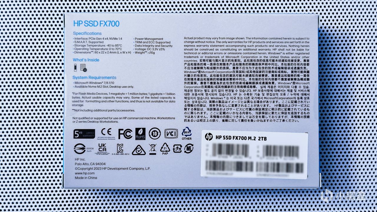 HP FX700固态盘的背面也有标签,对应的就是容量、SN码、质保时间、认证等相关信息,同样建议不要撕掉,这也会影响到产品的质保售后。