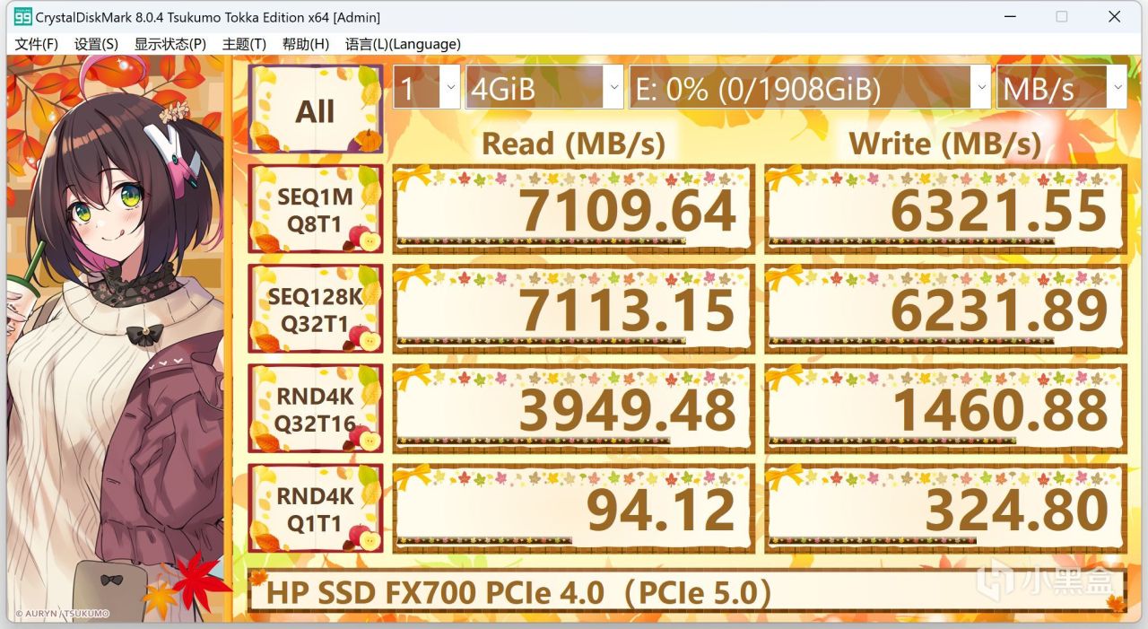 虽然HP FX700固态盘是安装在PCIe 5.0(GEN5)M.2硬盘槽位上进行测试,但是毕竟还是一块PCIe 4.0 NVMe SSD,可以看到传输模式仍旧是:PCIe 4.0 x4。