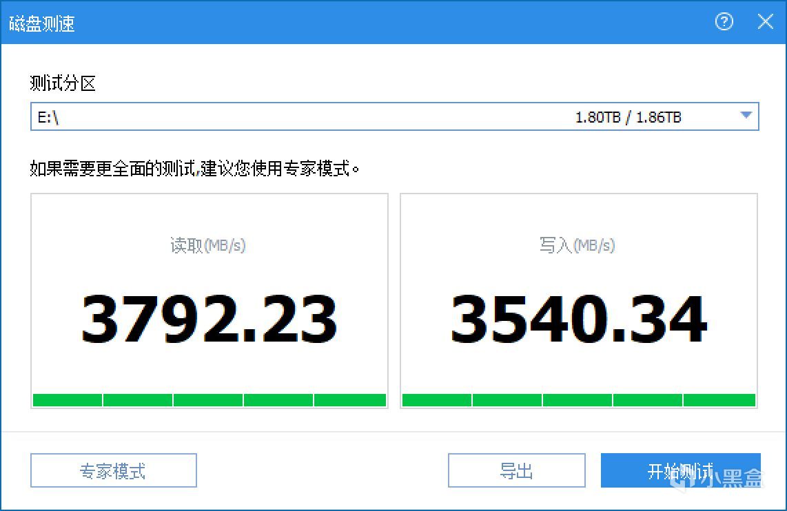 用傲梅分区助手的磁盘测速,可以看到读取速度:3792.23 MB/s,写入速度:3540.34 MB/s,这个读写速度在移动固态硬盘盒里绝对是最顶级的性能了。