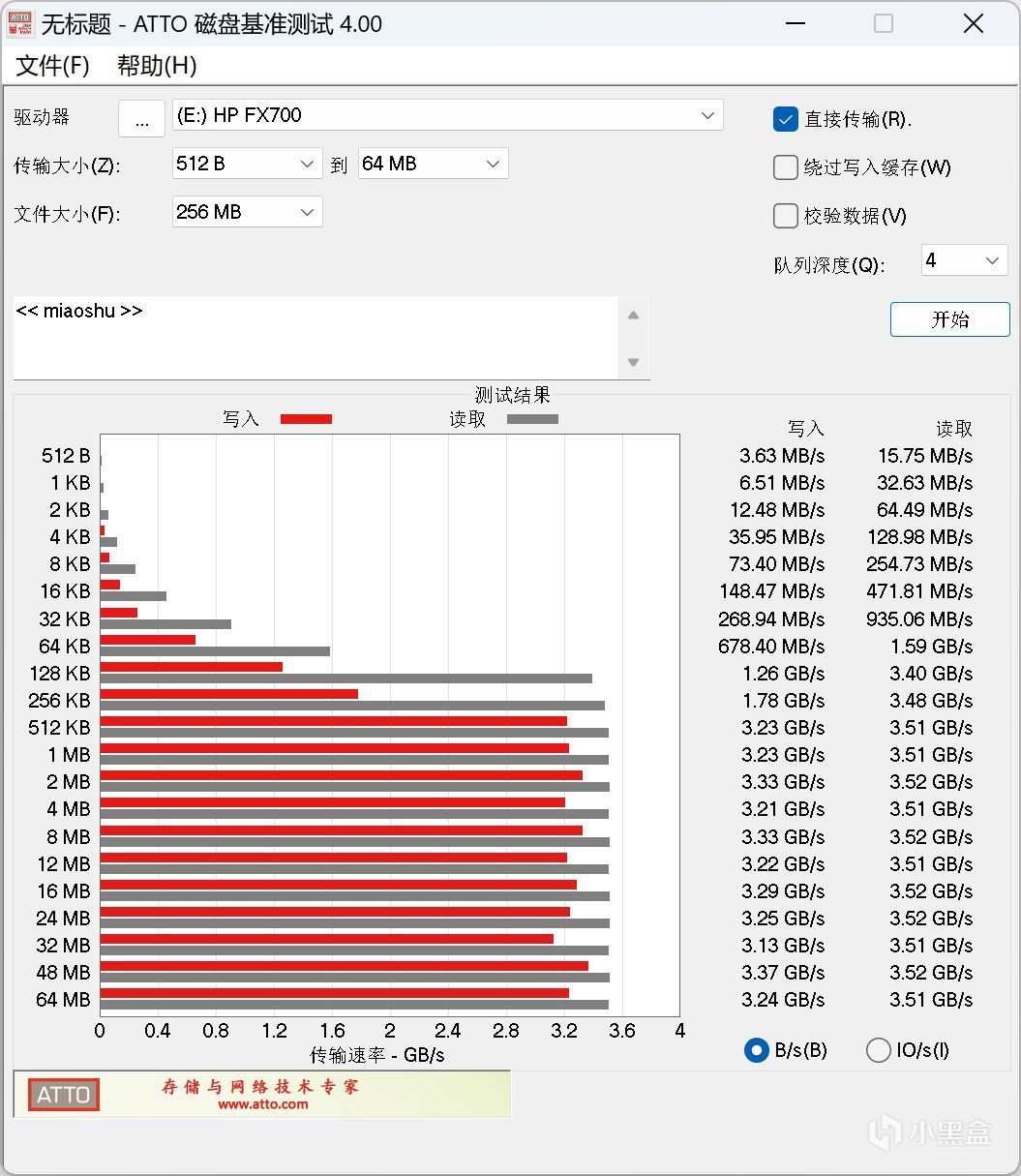用ATTO Disk Benchmark软件测试小文件的读写情况,传输大小从512 B到64 MB,文件大小:64 MB进行测试,默认是:直接传输,可以看到读取速度维持最高在3.52 GB/s,而写入速度维持最高在3.37 GB/s。