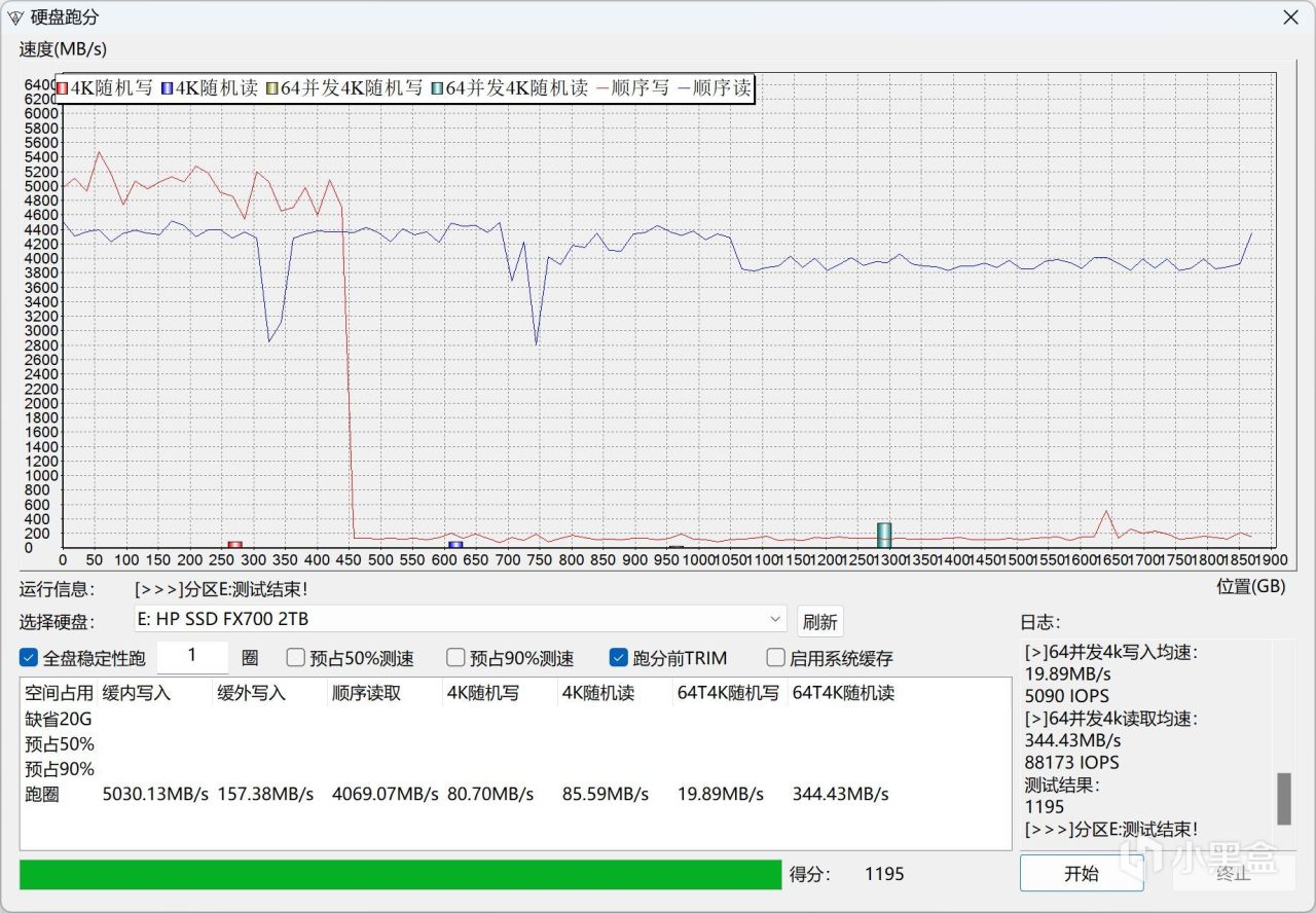 用白眼软件测试硬盘跑分的实际得分:1195,缓内写入:5030.13 MB/s,缓外写入:157.38 MB/s。可以看到高速缓存空间,也就是slc缓存区有着高达450GB的容量。