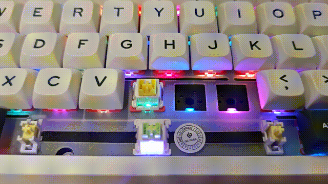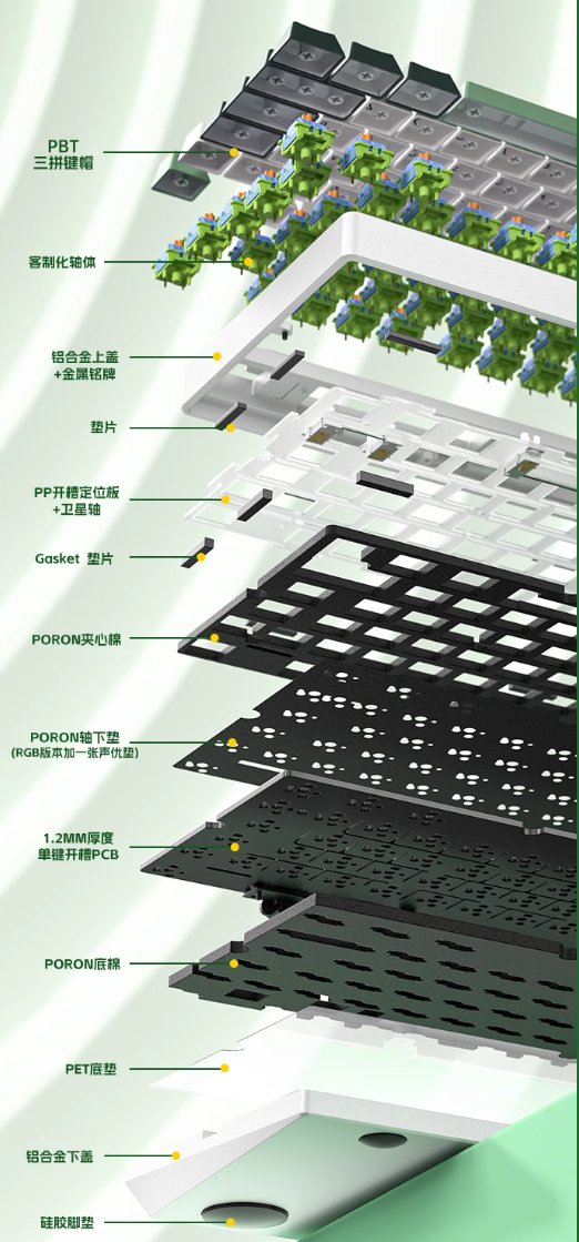 鍵盤採用Gasket結構,加上四層PORON+PET消音墊,進一步減輕了空腔音,更好的還原了按鍵聲音。PCB單鍵開槽,定位板橫向開槽,按鍵更穩定、聲音更HIFI。