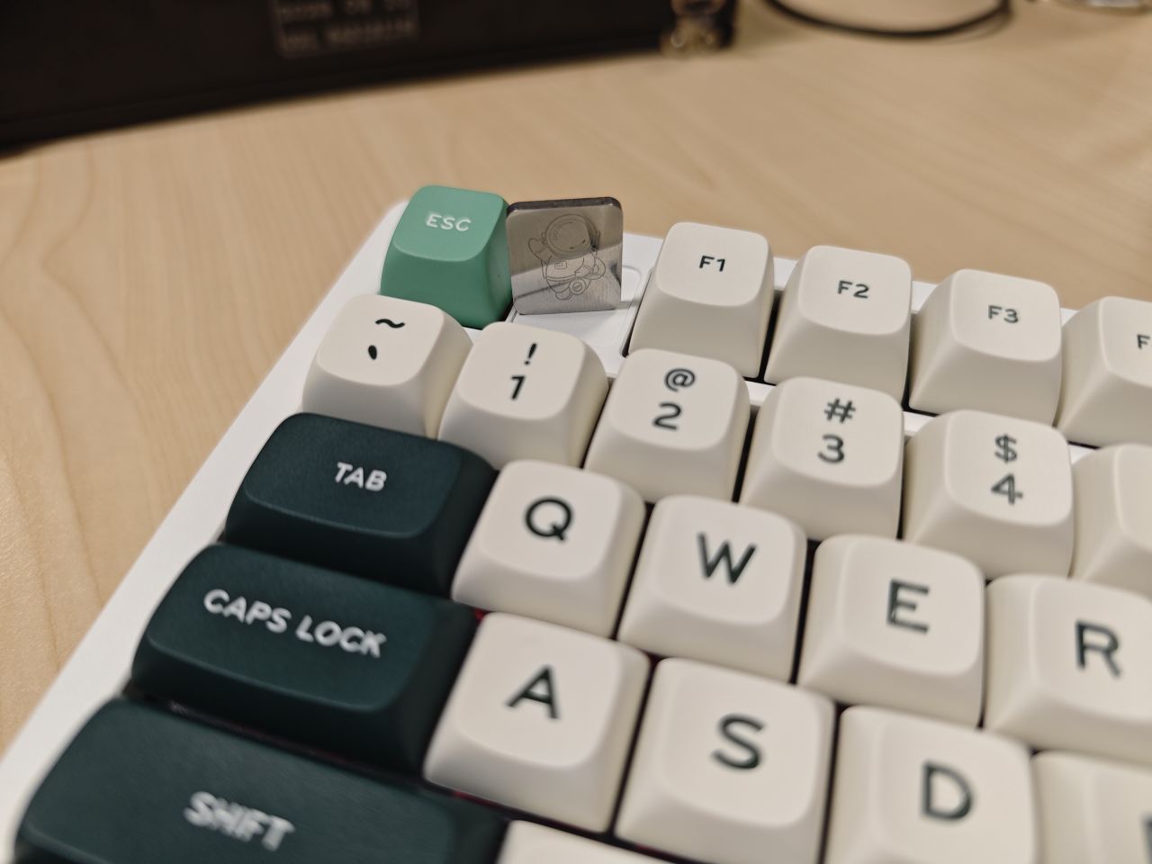 鍵帽採用的是PBT三拼色鍵帽,PBT材質觸感乾爽、細膩,長時間使用也不易打油,經久耐用。鍵盤左上角有個“太空人”圖案的金屬小牌子,下面就是磁鐵。