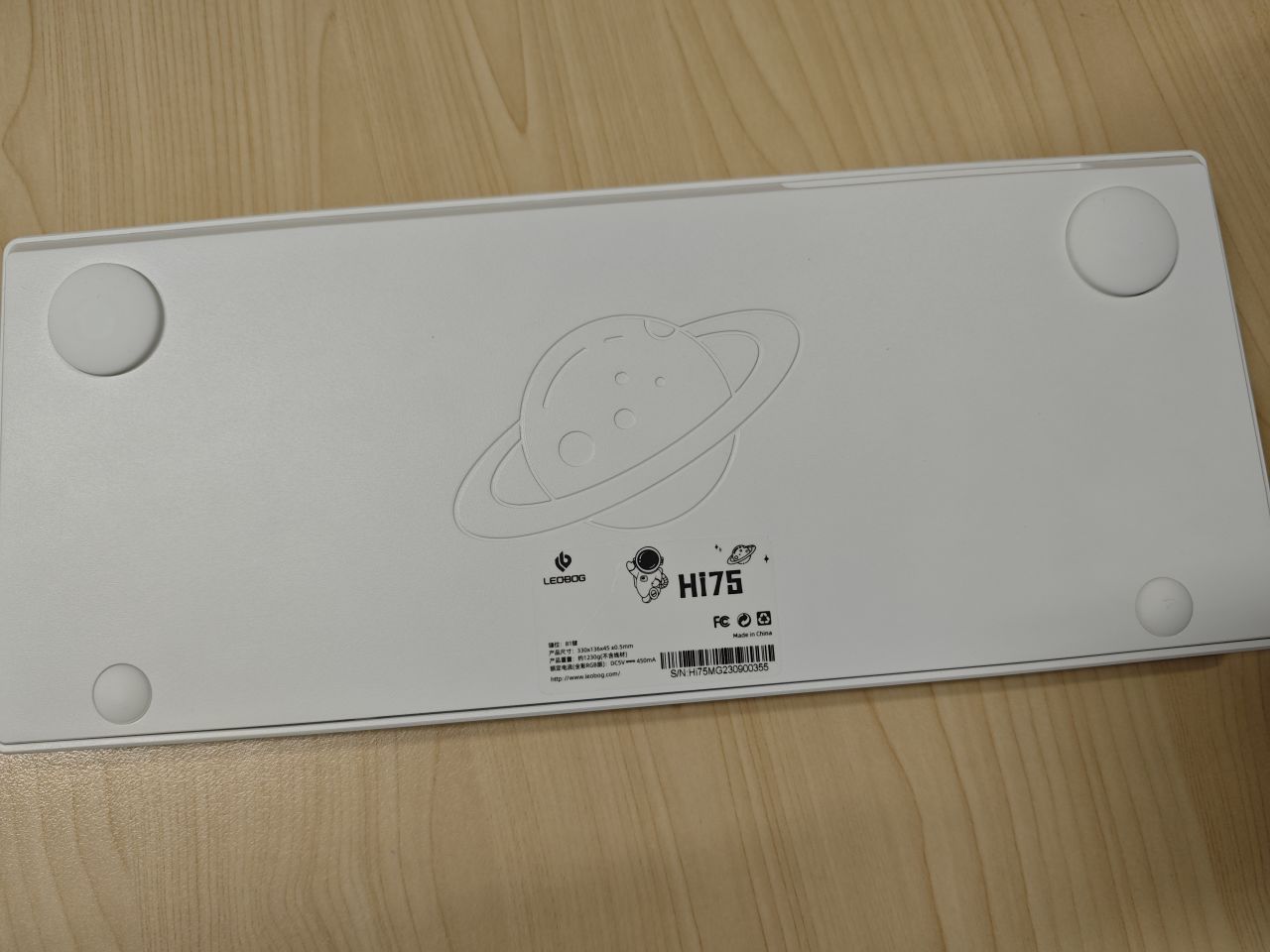 鍵盤底部的中間是星球的圖案和品牌的信息,卡通圖案很可愛。四個角是圓形的硅膠防滑墊,如果桌面太光滑,建議加一層桌墊在上面,以免鍵盤滑動。