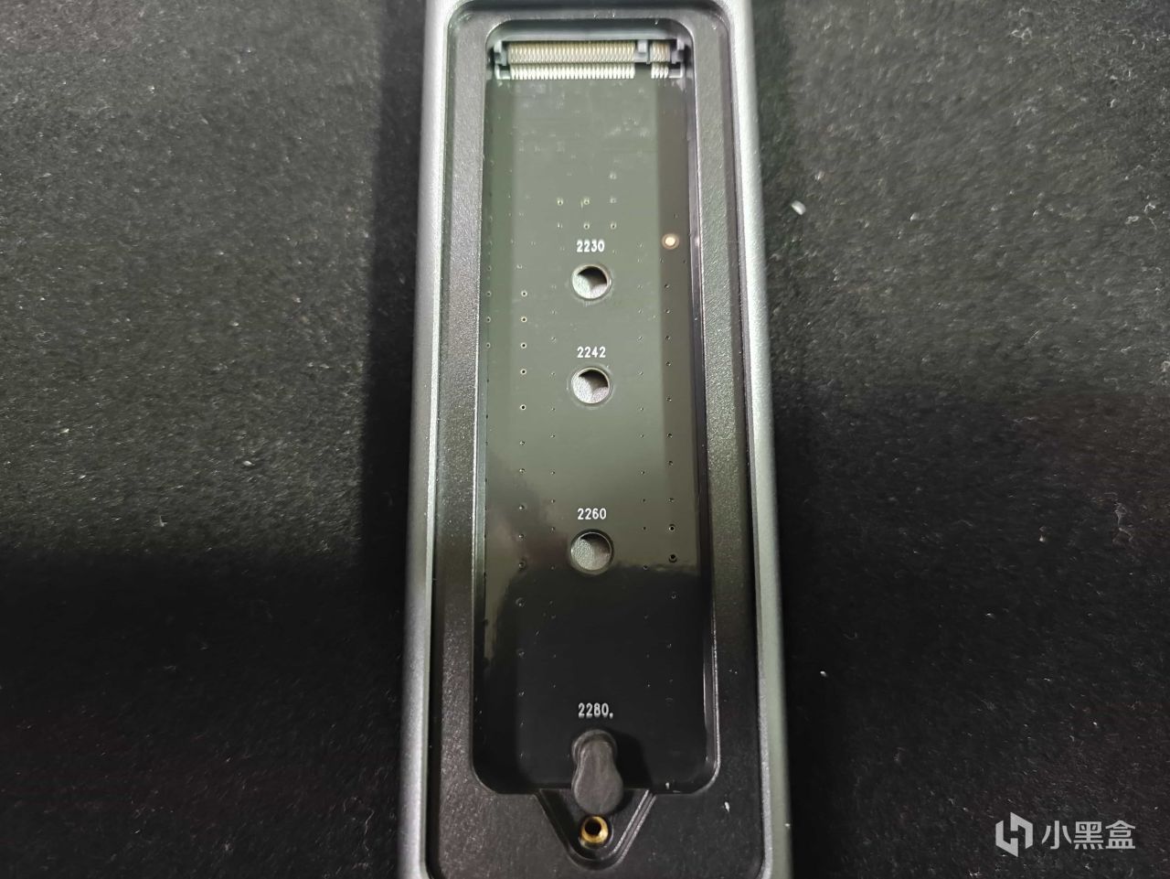 拧开上面的螺丝,即可卸下这个盖子。可以看到里面的四个预留的橡胶塞的位置,其分别对应了2280、2260、2242、2230这四种型号的硬盘。