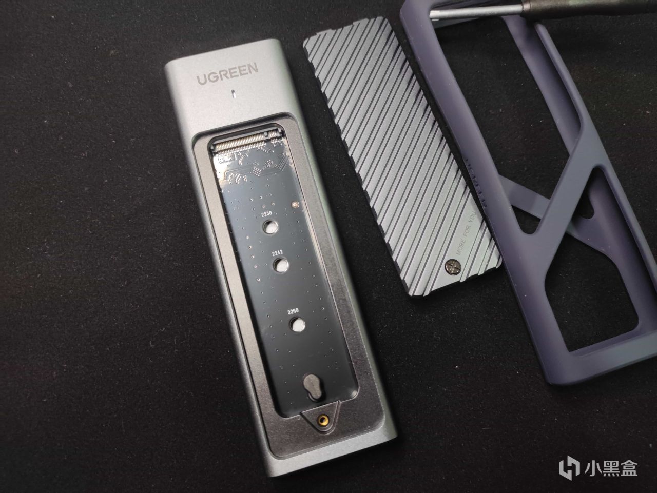 然后就是将贴到固态硬盘上,然后盖上盖子拧上螺丝即可。值得一提的是,导热硅胶条的导热系数有2W。其实仅凭铝合金的被动散热在大部分场景下也都足够使用了。所以并非一定要贴上,还是结合各自的使用环境。