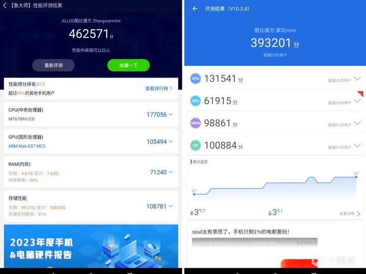 上图的娱乐大师的跑分和兔兔的跑分,娱乐大师46万这个成绩,在同价位里妥妥的头部存在。这也说明,系统的底层优化处理的挺不错。
