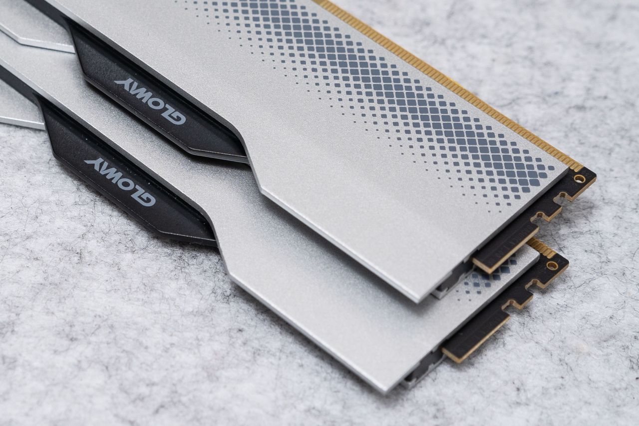 光威龙武 DDR5 6800Mhz内存为无光马甲设计,采用深空灰的全铝合金散热马甲,表面喷砂雾面处理工艺,触感细腻。散热马甲上方为不规格斜切流线造型,正反面错位安装,中间位置有黑色塑料饰条,带有灰色GLOWAY的LOGO丝印,右侧有DDR5字样表示,下方位置菱形线条堆叠纹理装饰,整体外观素雅简约。内存背面的散热马甲上多了产品铭牌标签和防伪码标签贴纸。