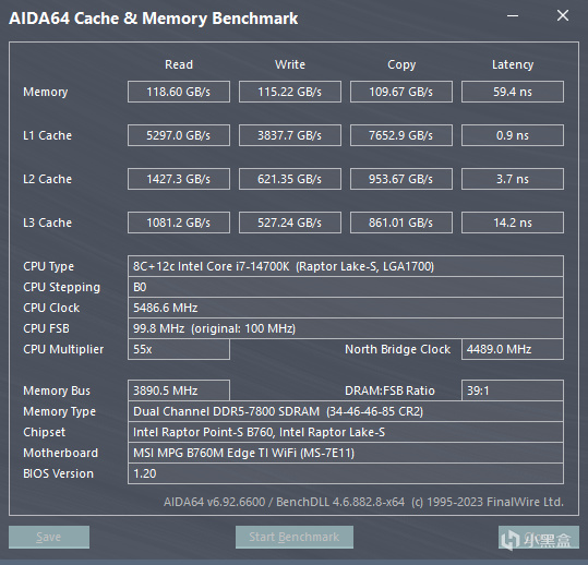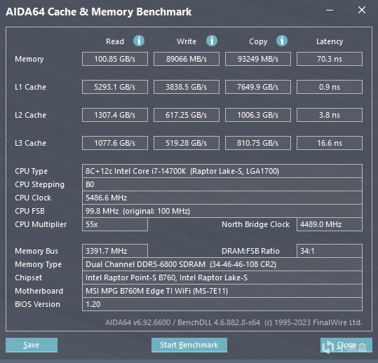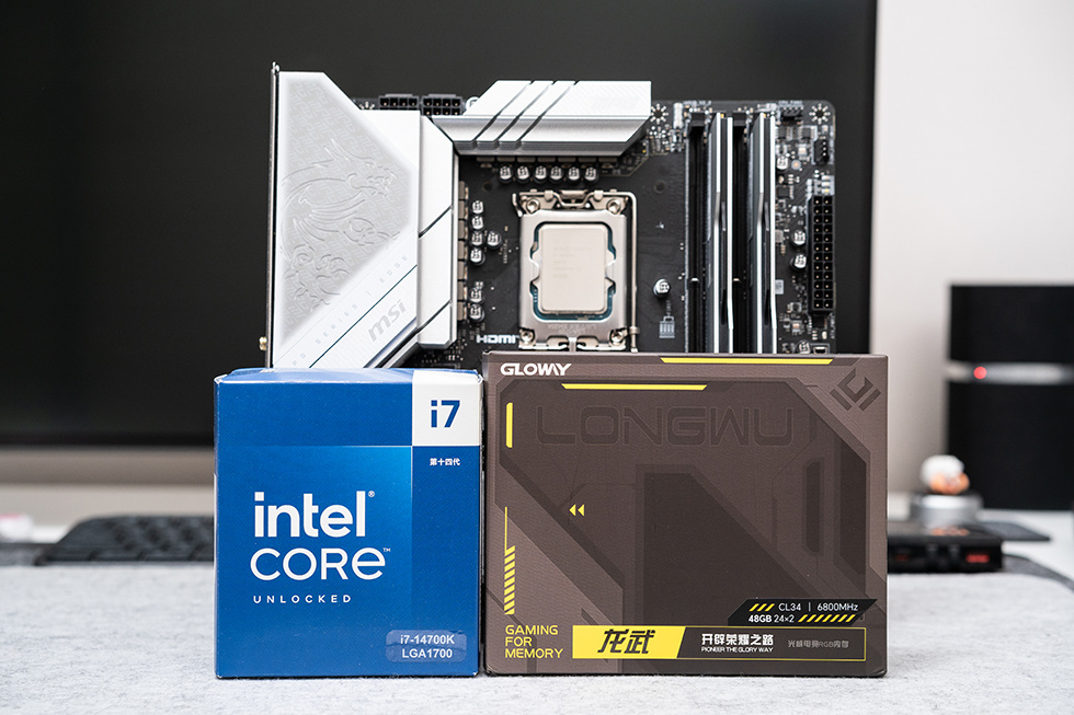 测试平台使用intel i7-14700K、微星MPG B760M EDGE TI WIFI搭配光威龙武 48GB(24GBx2 ) DDR5 6800 内存。