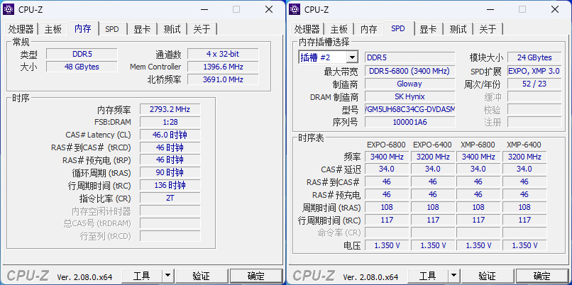 在JEDEC内存规范下的频率是5600MHz,时序为46-46-46-90,电压1.1V。支持英特尔XMP 和 AMD EXPO一键超频,分别提供了2套预设。