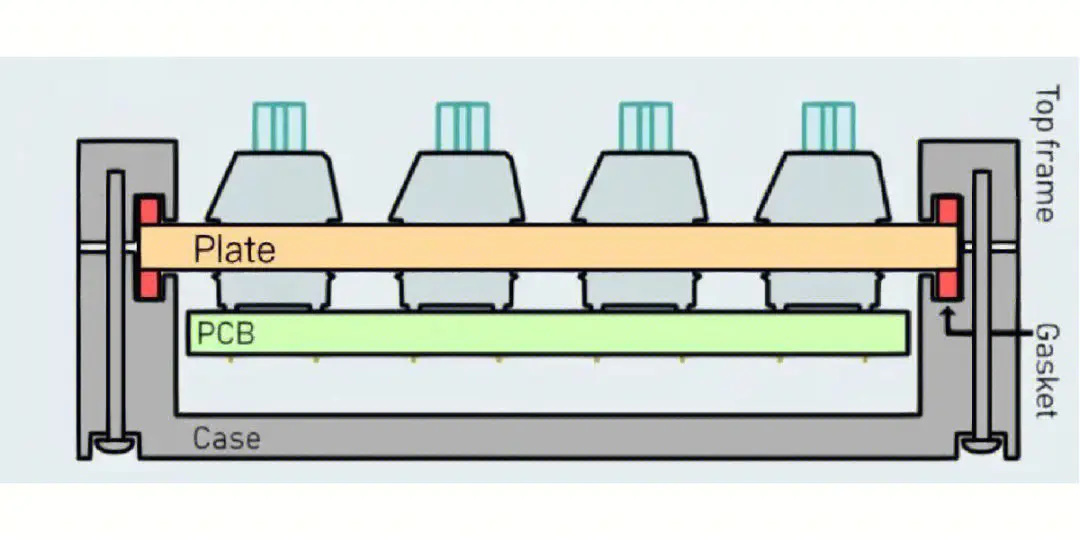 之所以會有這麼清脆的聲響,還是因爲近些年非常流行的Gasket結構,而巴蛇PRO則是用上了非常新的Gasket PRO技術,在傳統Gasket的基礎上,使定位板依靠Poron材料懸浮在鍵盤內部,並提供彈性緩衝行程,進一步減少內部空腔音及雜音,讓敲擊聲音更加清晰純粹。雖然缺點是用力按壓鍵盤會有微小下彈,但對於使用影響幾乎可以忽略不計。