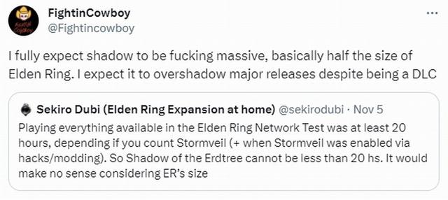 —油管主Oroboro在直播中也暗示,DLC“黃金樹之影”時長將超過25小時。他說:“如果你期待25小時的冒險,那這款DLC可能會滿足你的期望,甚至更多”,這也表明了DLC將很龐大。不過隨後Oroboro刪除了直播錄音,或許他意識到自己無意泄露了DLC消息。