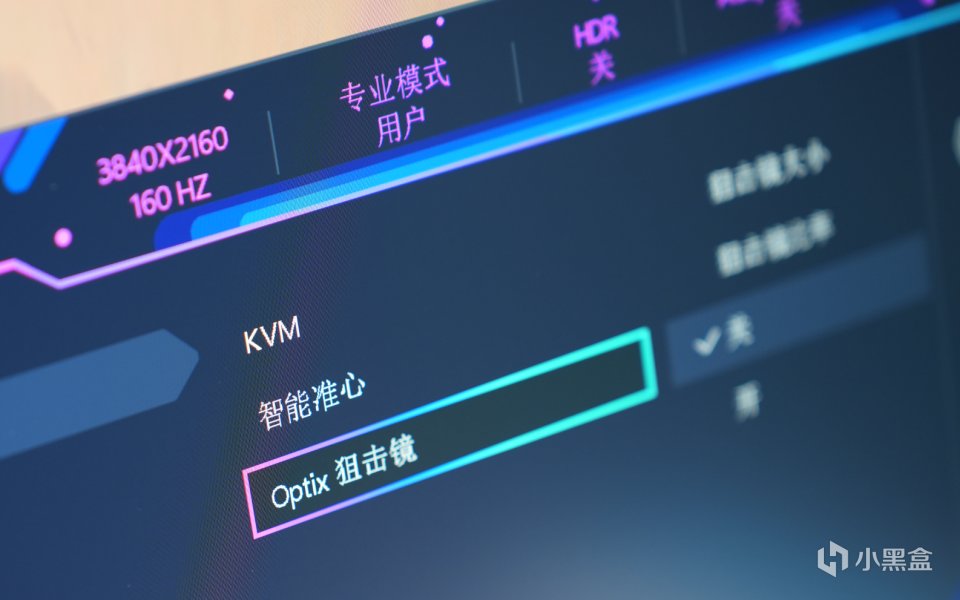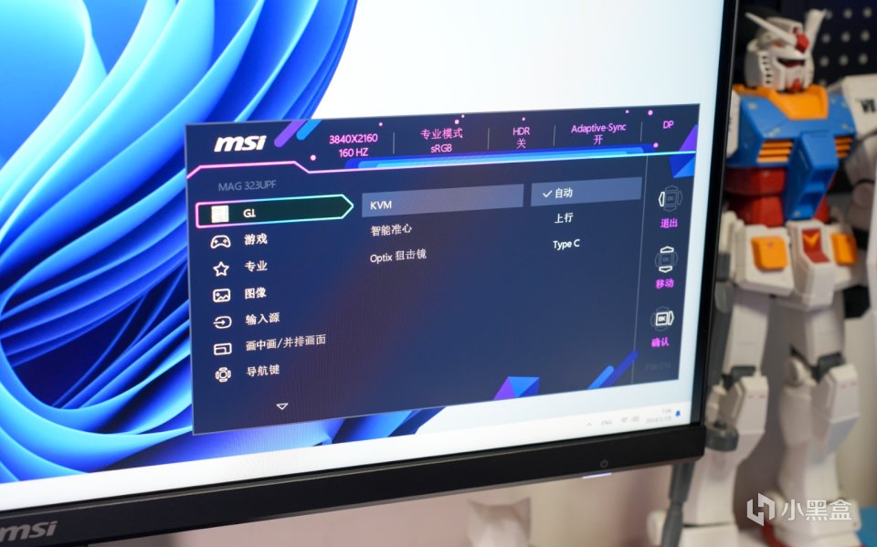 同时,微星MAG 323UPF搭载的OSD也非常好用,提供很详细的各项功能与参数的调整。比如打开最常用的就是KVM功能,方便用户用一套键鼠套装控制不同设备;还有堪称物理外挂的“智能准星”和“狙击镜”等