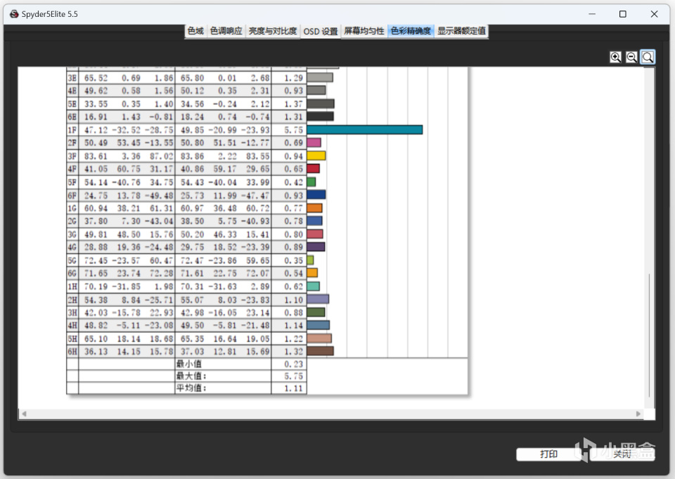 色彩精准度方面,建议使用微星MAG 323UPF的SRGB模式。通过48色色彩精准度的测试,最小值为0.23,最大值也仅为5.75,ΔE平均值为1.11,稍微校色一下都可以轻松胜任专业的修图工作。