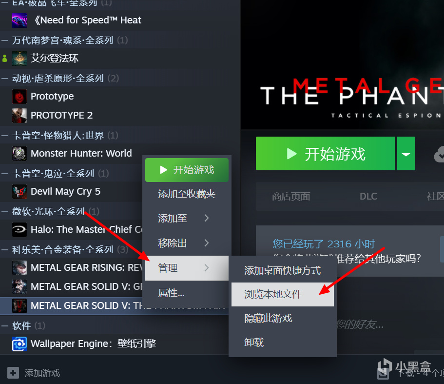 第二步:右键游戏-管理-浏览本地文件(打开游戏安装目录)。