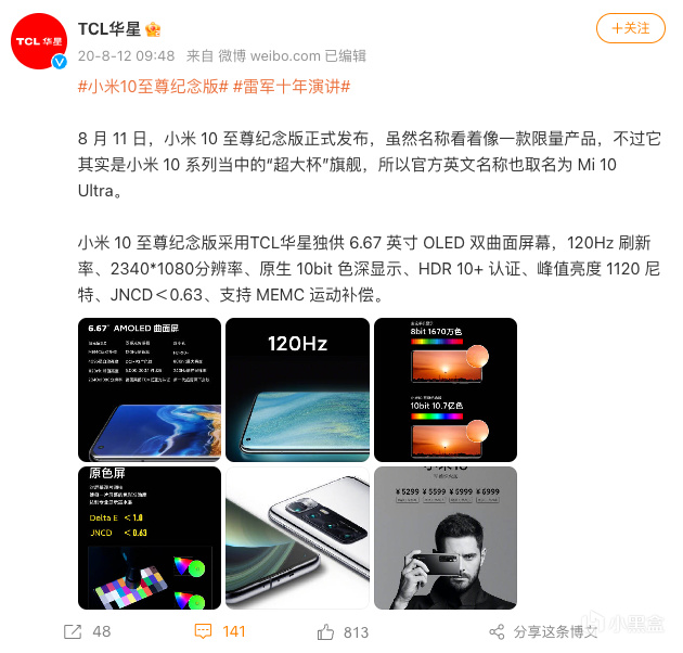 终于,到了2020年,5999元的小米10至尊纪念版——当时小米正式对市场发售最贵的旗舰机型上,采用了华星光电的旗舰级屏幕,迎来的却是掌声——为国产屏幕正了名。