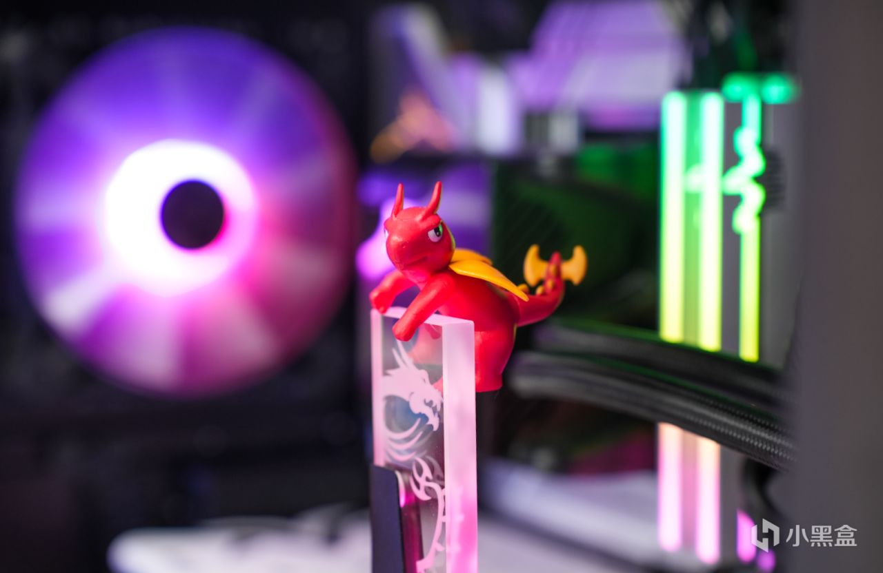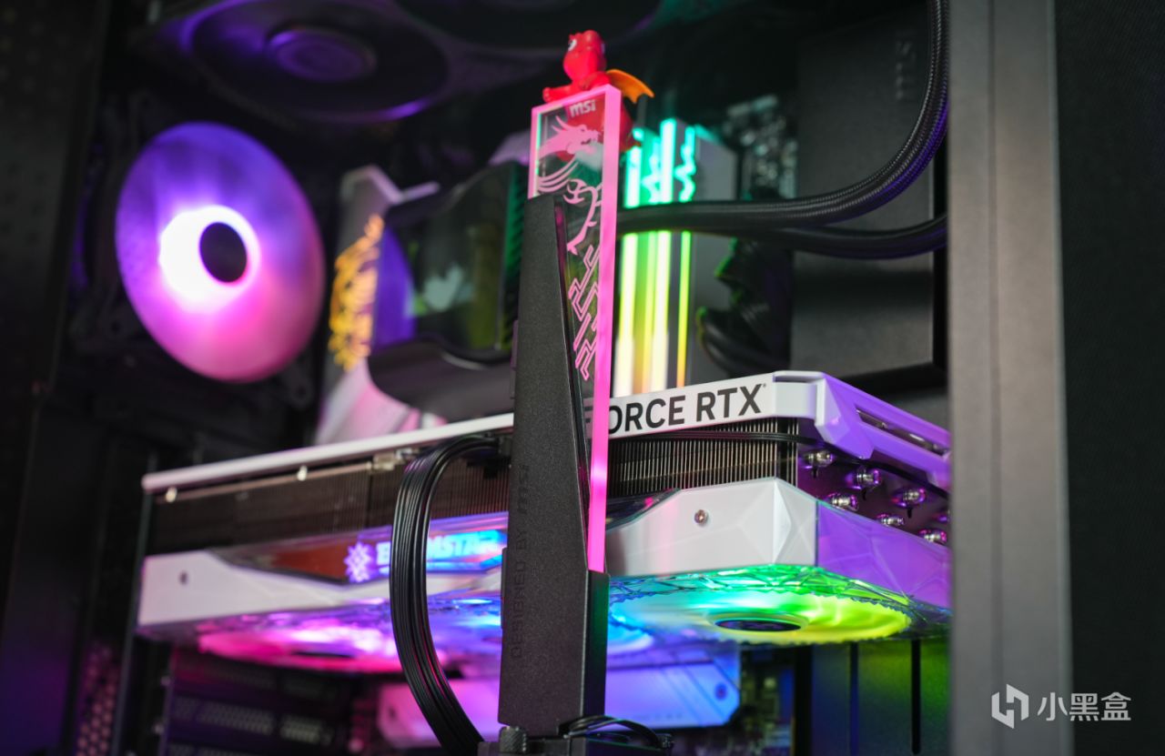 比如为了强化散热,前面板采用镂空设计的金属防尘网+预装ARGB风扇设计,内部还有一个支持ARGB灯效的显卡支架,为此我也没使用影驰原厂的支架。总之微星氪金枪3机箱出厂就是满配状态(4个ARGB风扇+ARGB显卡支架),喜欢光污染的小伙伴值得尝试。