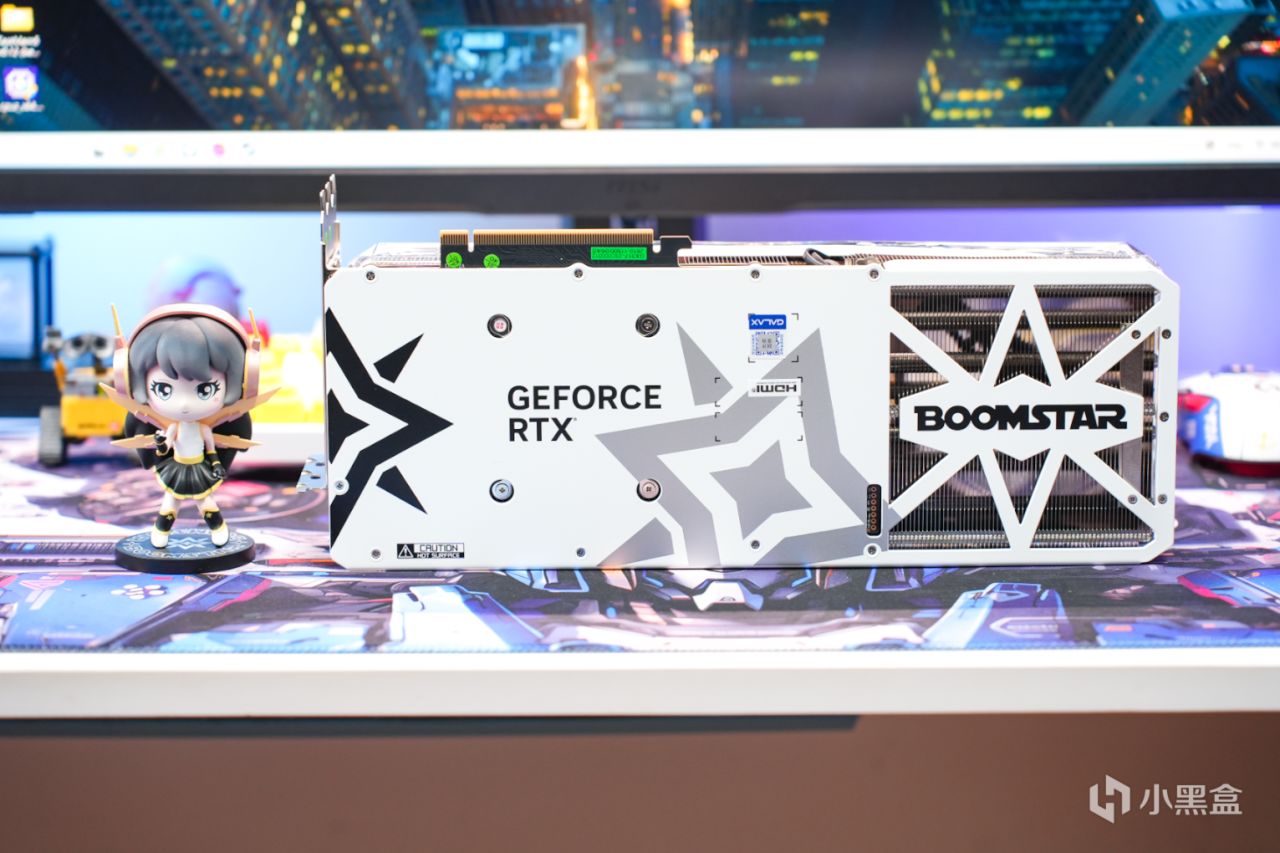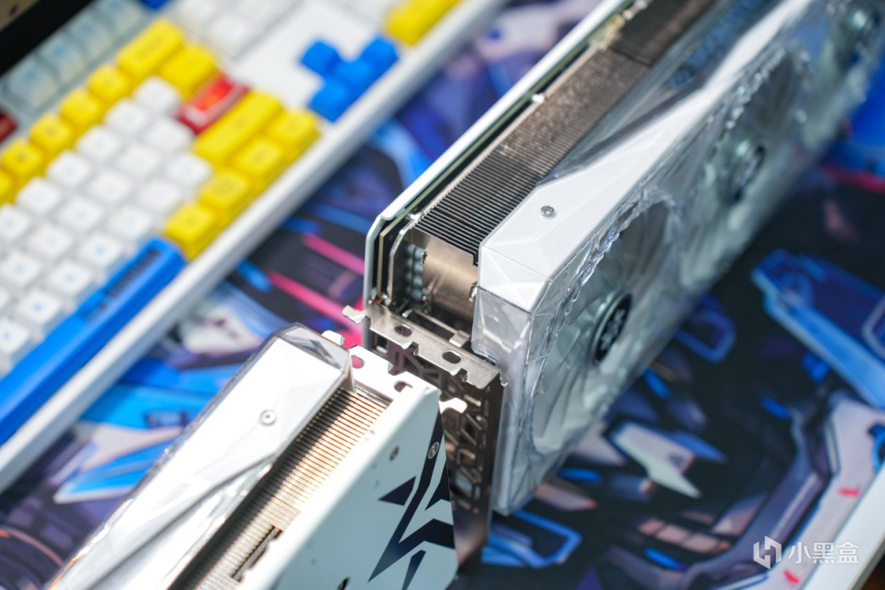 显卡的背面采用的是白色金属的背板,上面不仅有星曜图案的点缀,并且金属挡板的尾部还采用了大面积的镂空处理,一方面可以提升显卡的整体散热效率,同时也进一步降低显卡的重量。