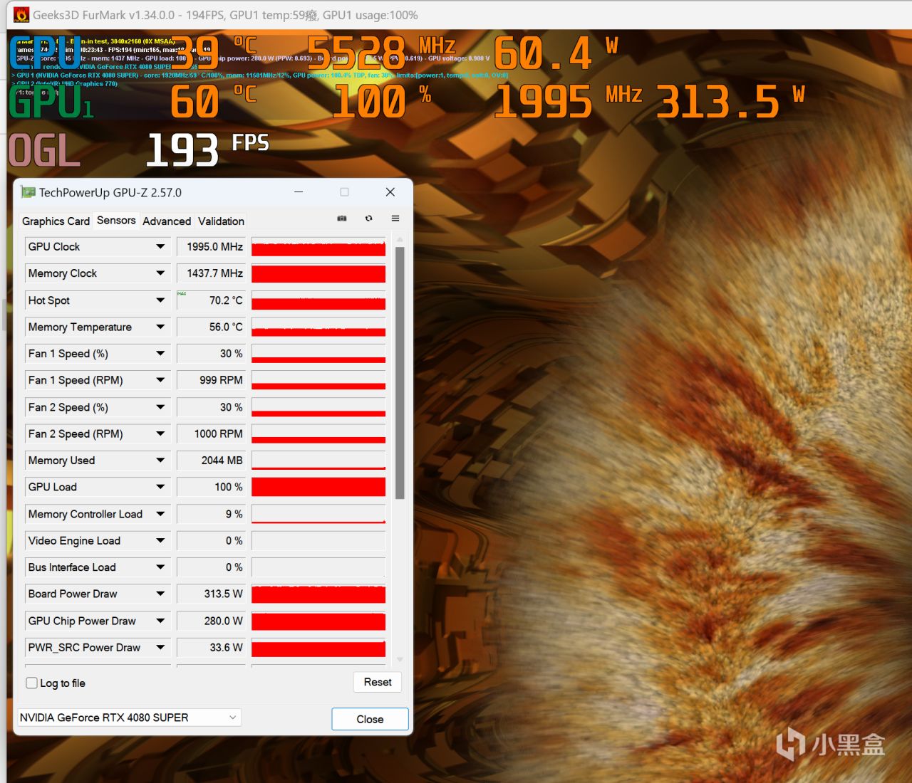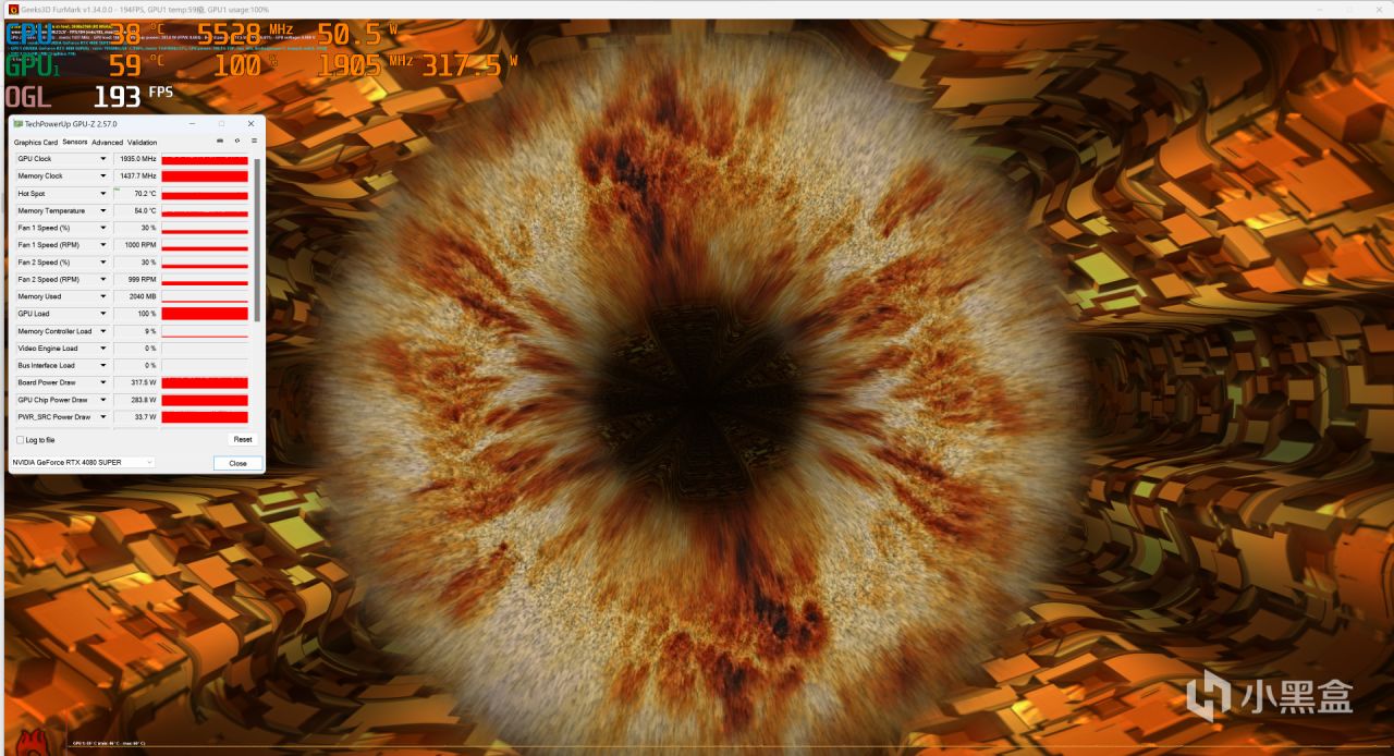 使用FURMARK拷机实测,影驰RTX4080 SUPER星曜OC显卡拷机功耗最大为320W左右,拷机20多分钟实测GPU核心温度仅为60℃出头。一方面该显卡的散热系统强悍;另一方面则是江西这段时间气温低,就算开了空调室温也仅为15℃。
