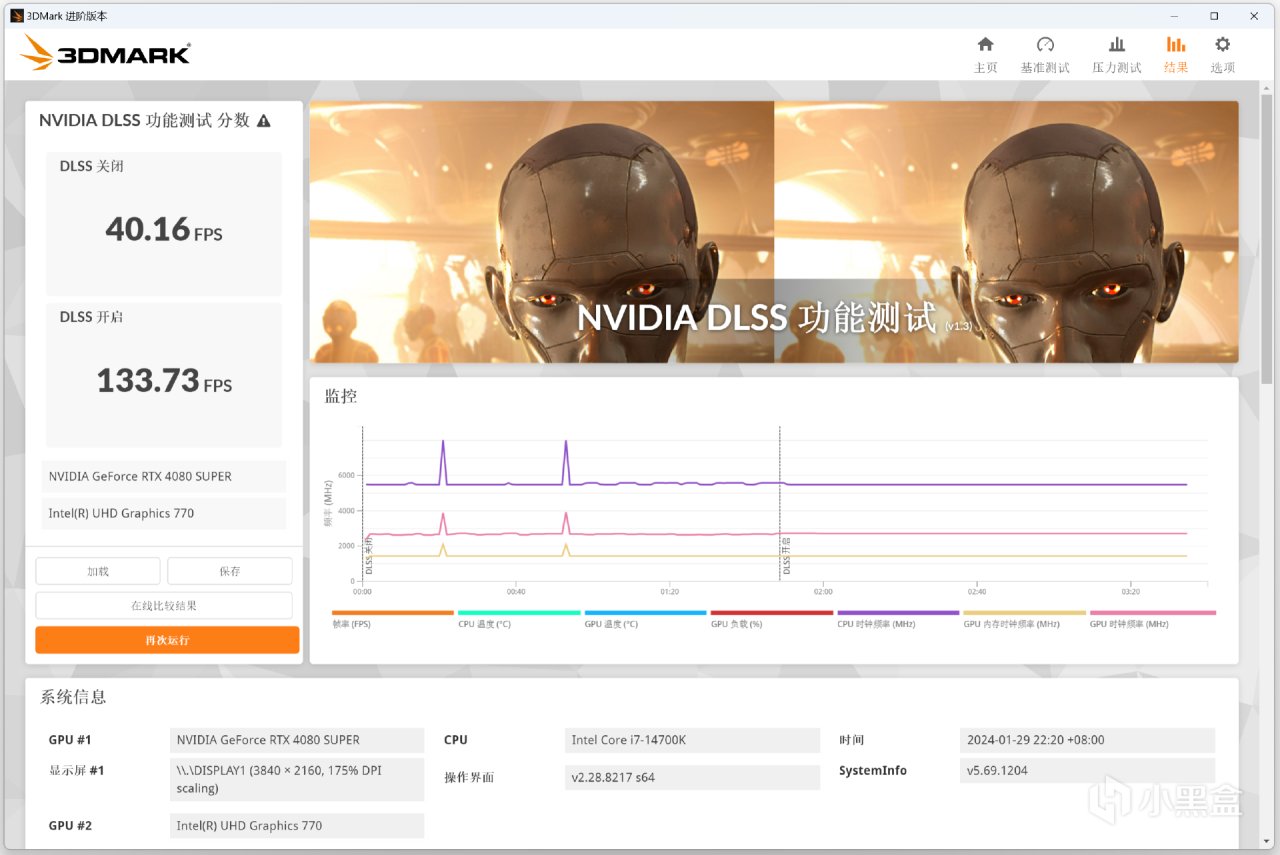 NVIDIA DLSS测试,关闭DLSS 4K分辨率下帧数为40.16FPS,开启DLSS 3.0后,帧数达到了133.73FPS。