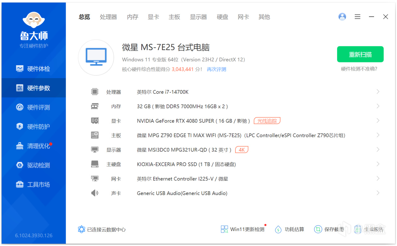 喜闻乐见的鲁大师跑分,影驰RTX 4080 SUPER星曜OC的得分为1041525分。