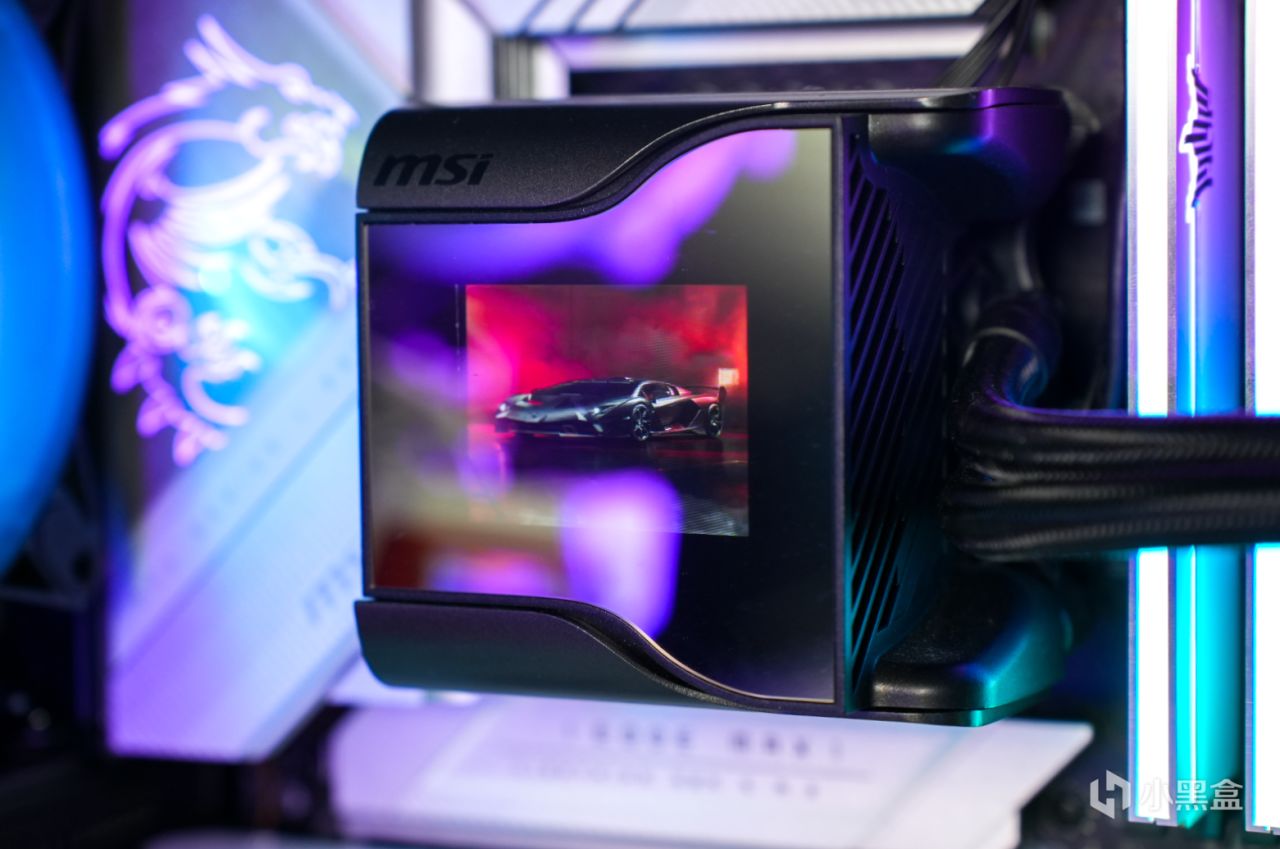 同时,微星MEG CORELIQUID S360的水冷头也是比较有创意的,内部除了一个6mm的下压风扇,还搭载了一个2.4英寸屏幕,可以自定义图片、视频,还显示CPU频率、温度等信息。