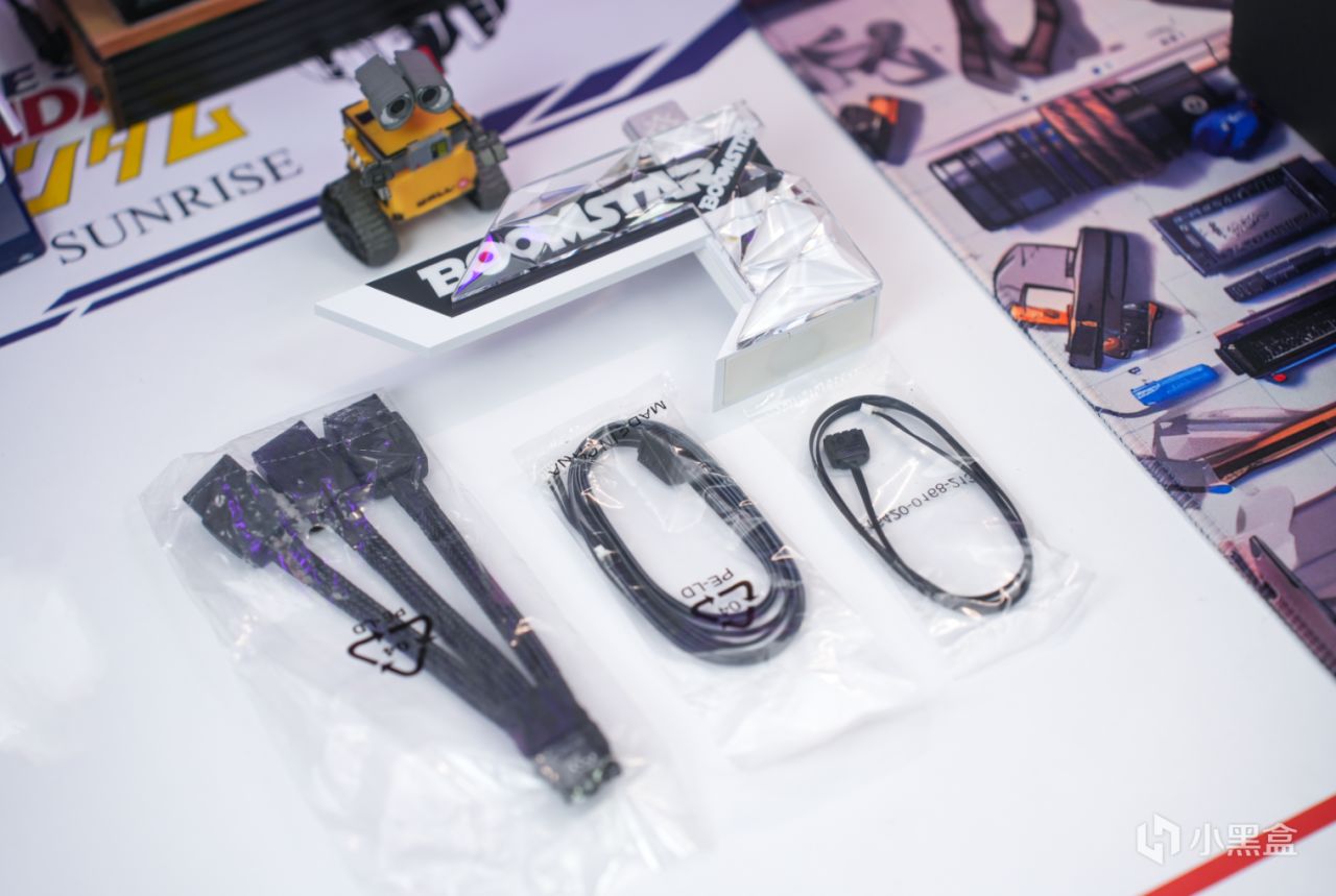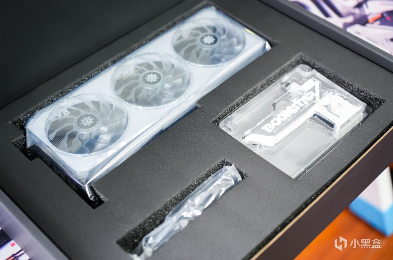 内部开箱也是熟悉的“三品”布局,上方为显卡,左下方为12VHPWR转换线、ARGB灯光同步线;右下方则是自带ARGB的显卡支架。