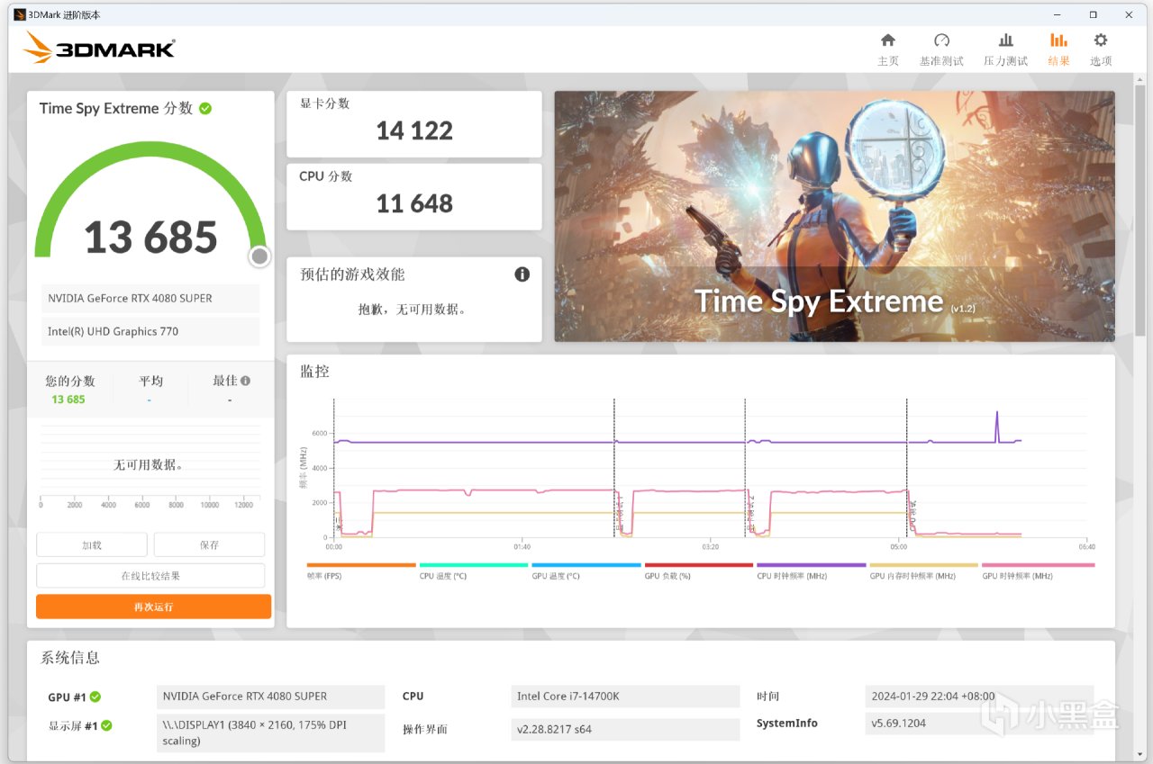 Time Spy Extreme分数为13685,其中显卡分数为14122。