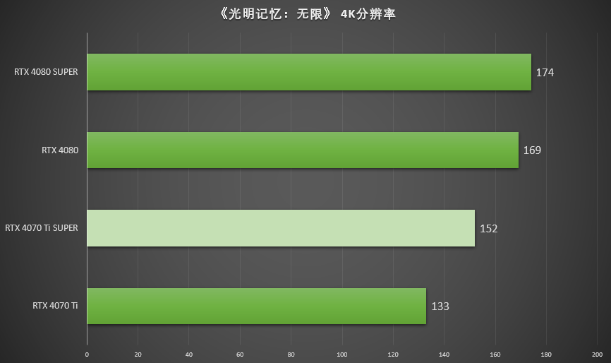 ▲在《光明记忆:无限》最高画质,光追最高,4K分辨率,DLSS 3开启下,七彩虹iGame GeForce RTX 4080 SUPER Vulcan OC能够提供174 FPS的平均帧率,是RTX 4080 平均帧率169 FPS的103%。