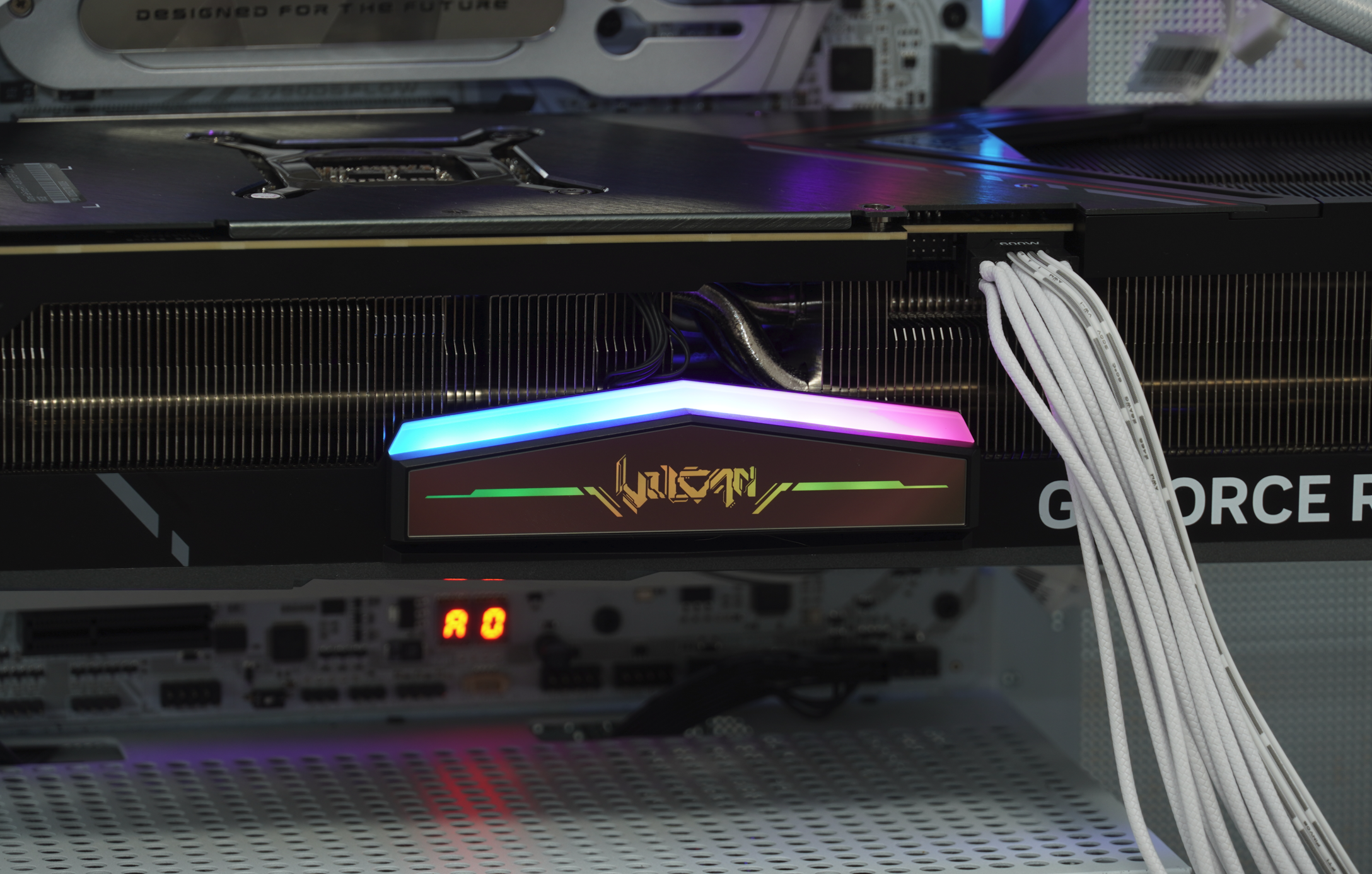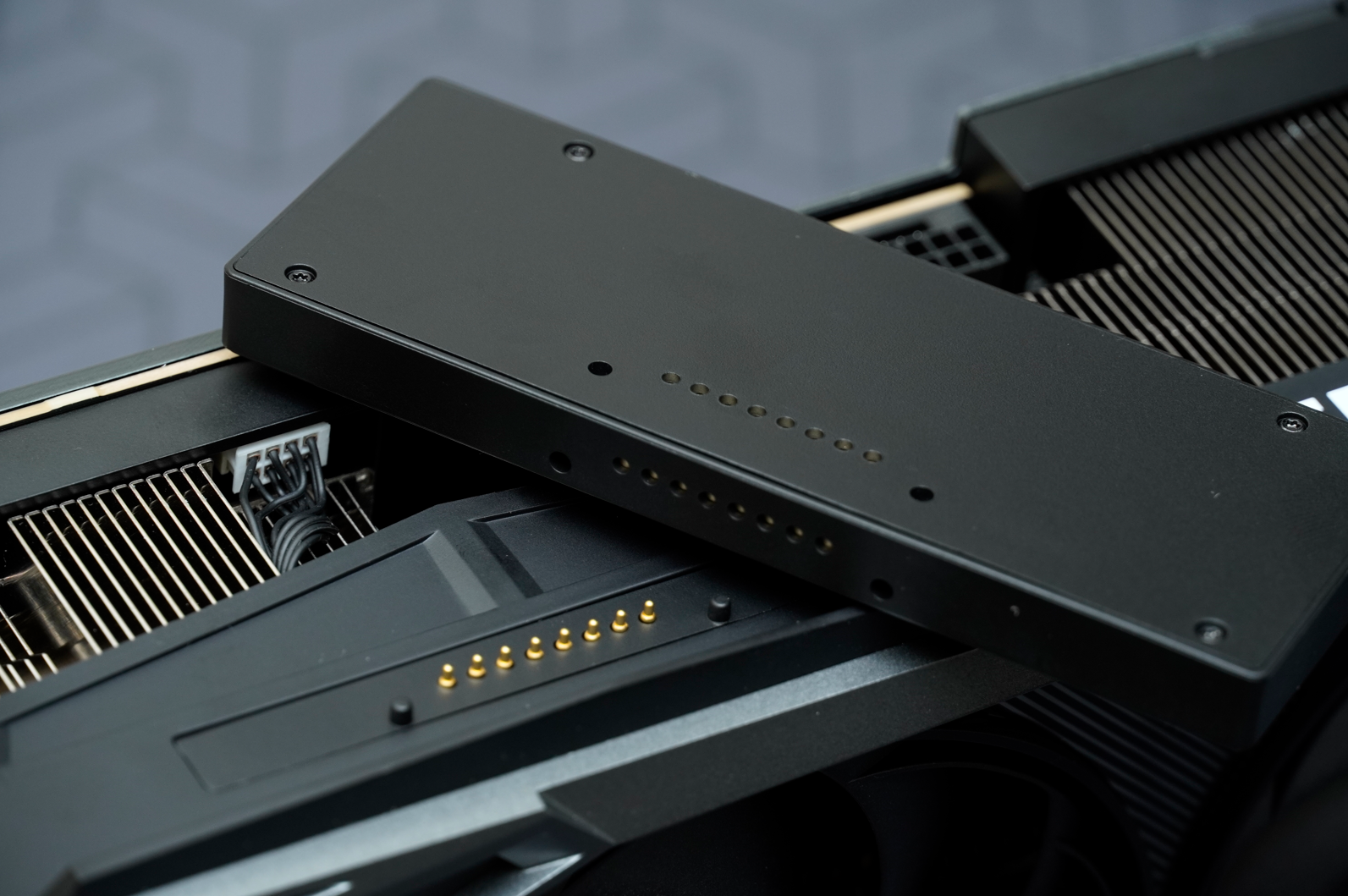 ▲背板也经过了优化,部分铝制散热鳞片直接露出,大幅加大了与空气的接触面积,同时方面热空气向上流动,通过CPU水冷的灯牌排出机箱,避免造成闷罐。