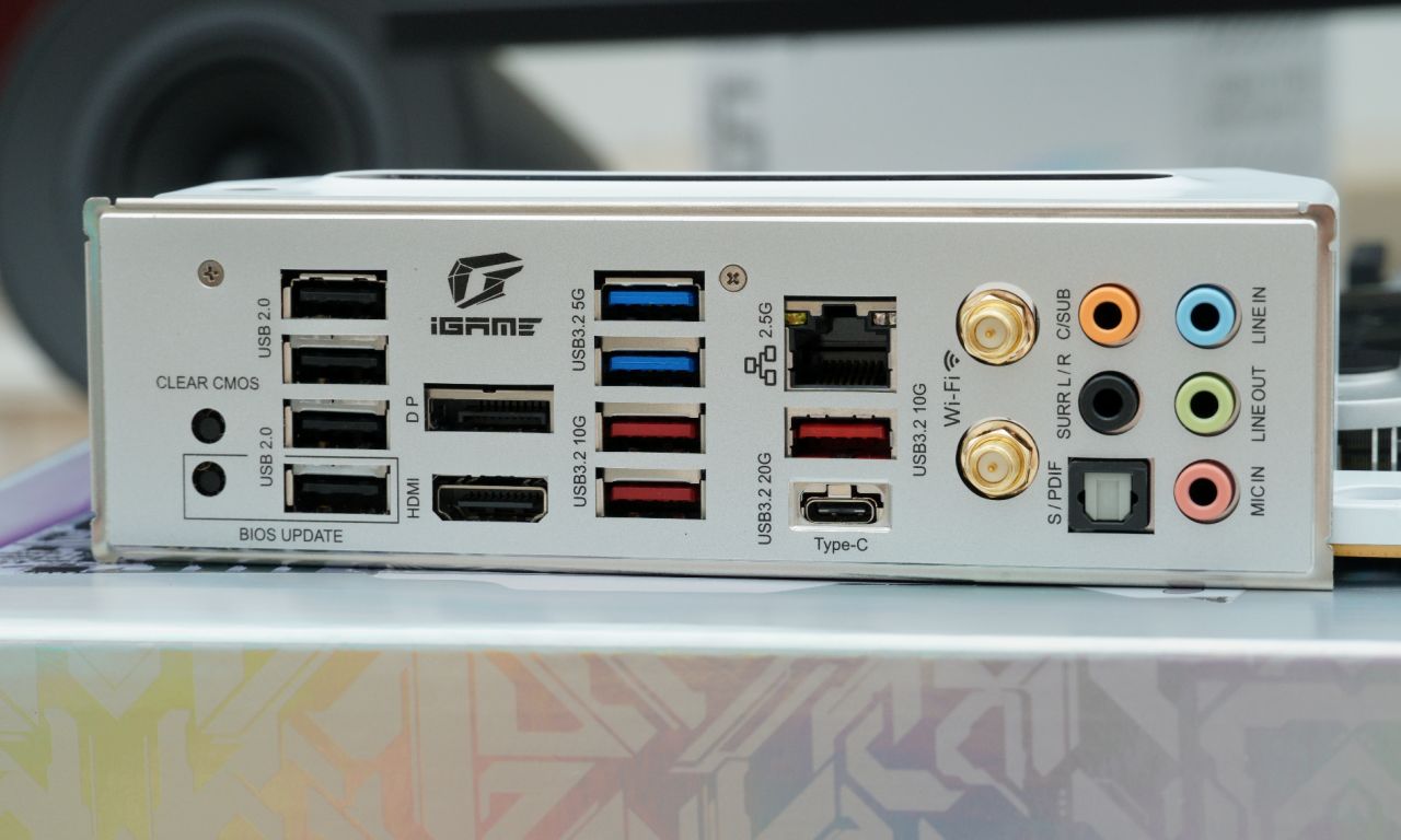 ▲作为旗舰级别的主板,一体式IO护甲必不可少,主板提供了DP1.4\HDMI 2.0接口各一个,3个USB 3.2Gen2接口(红色,10Gbps),2个USB 3.2 Gen1接口(蓝色,5Gbps),4个USB 2.0接口,一个USB3.2Gen 2x2 Type-C接口(20Gbps,支持30W PD充电),1个2.5G有线网络接口,WiFi 6无线网卡天线接口以及一组(5个)3.5mm音频接口与一个光纤音频输出接口,算是比较齐全的。