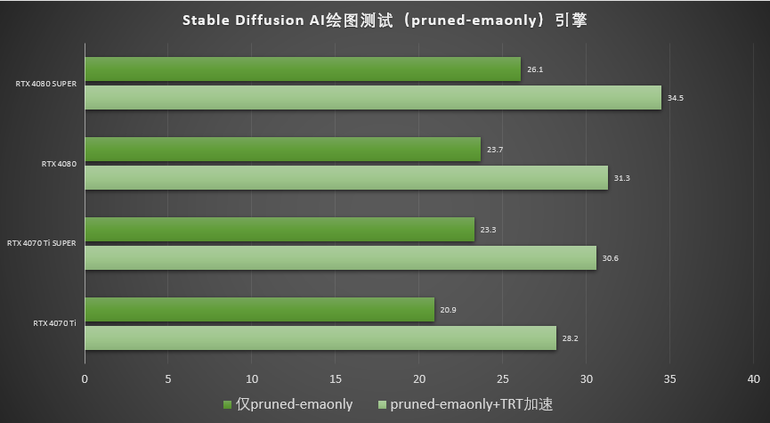 而不开启TRT加速时, RTX 4080 SUPER的AIGC速度是RTX 4080的119%。