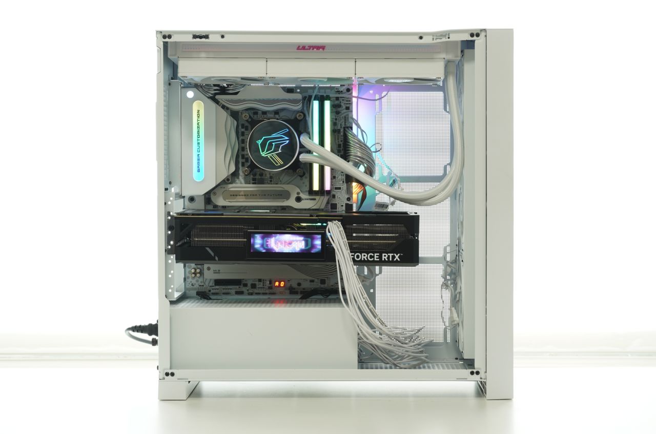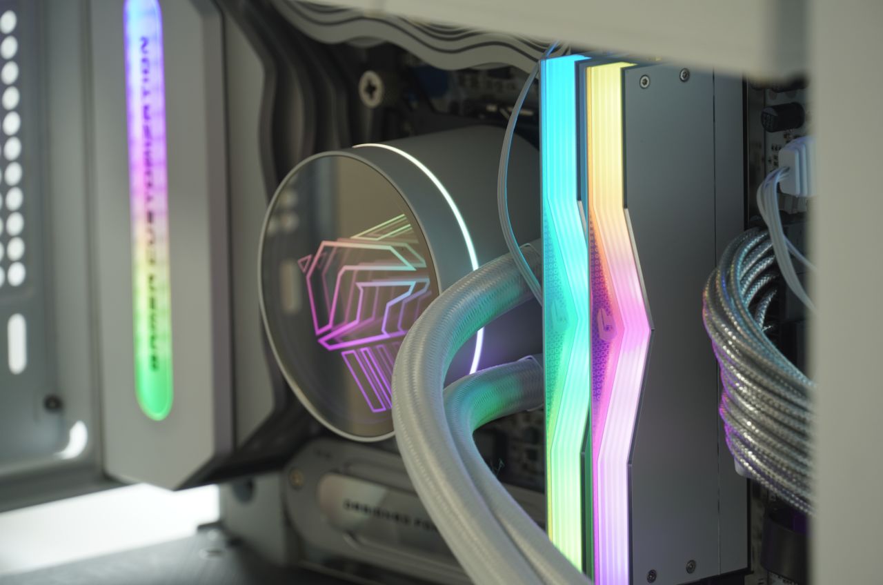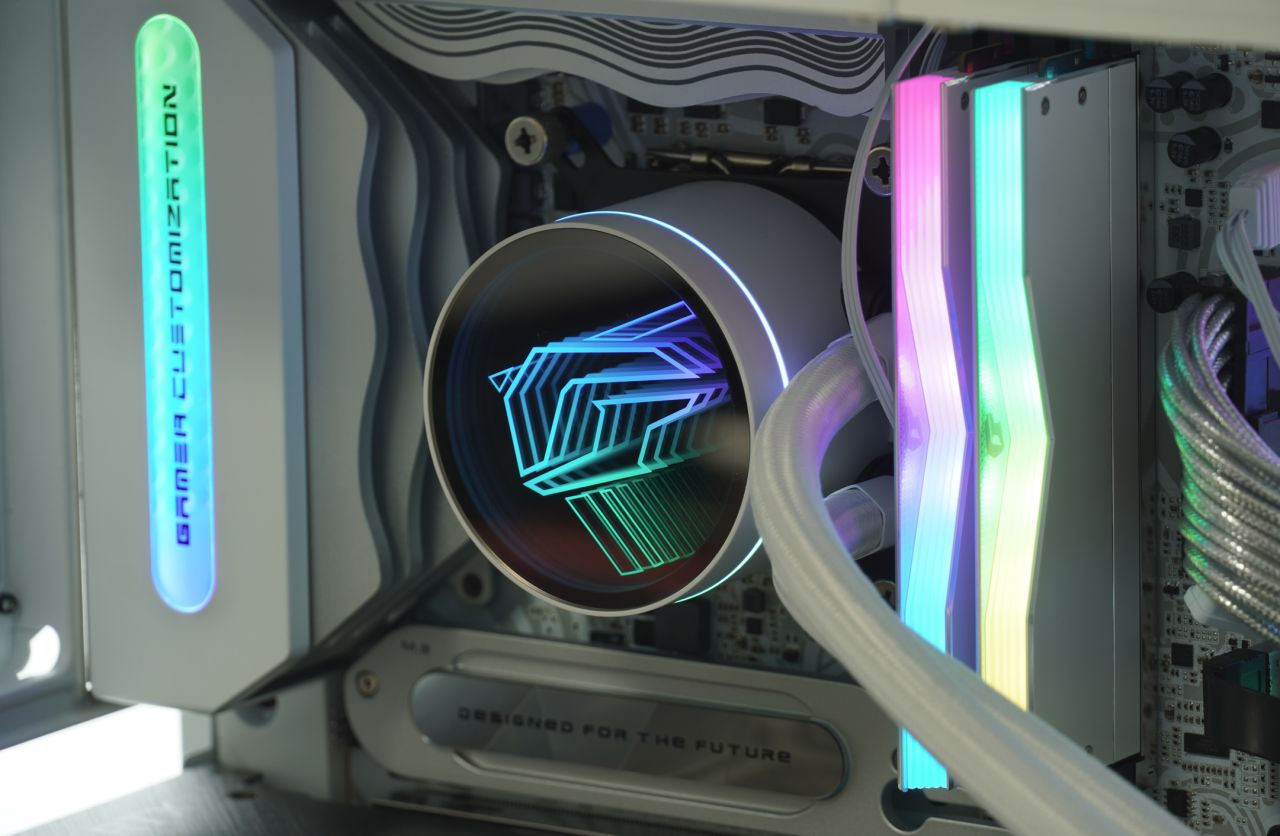 ▲iGame LQ360 Ultra W采用了“深渊镜”ARGB灯效凸显iGame LOGO,侧边有额外同步灯圈设计,风扇也采用了Ultra家族产品线专属的饰条。水冷采用了纯铜底座、可提供3000R澎湃动力的9极高速马达与加密型的360水排,散热性能也十分优秀,实测可以为不手动超频的i9-14900K提供充足的散热能力。