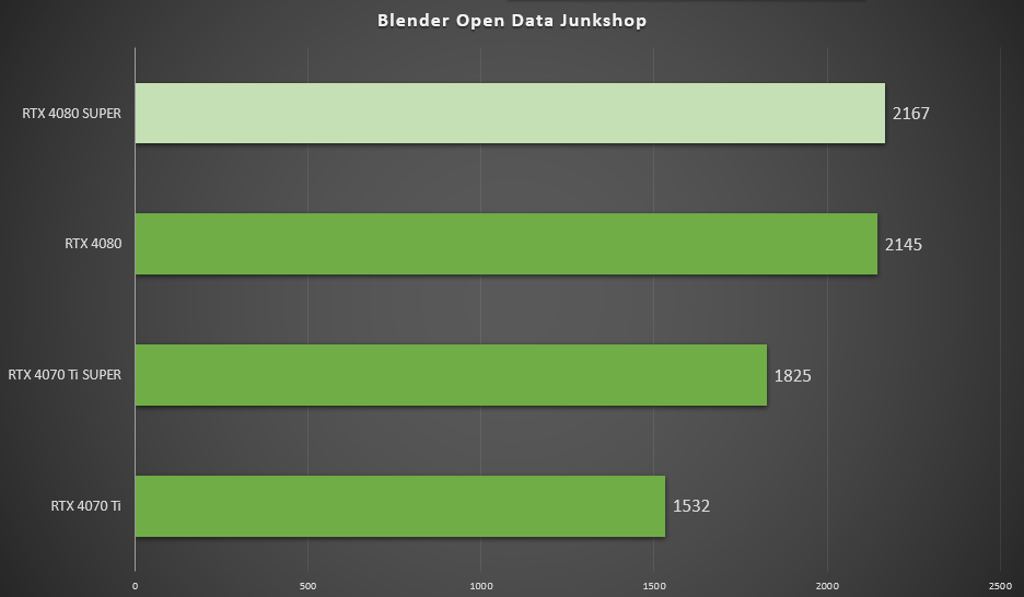 ▲在Blender Open Data Junkshop中,七彩虹iGame GeForce RTX 4080 SUPER Vulcan OC得分2167,是RTX 4080 得分2145的101%。