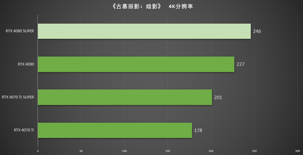 在测试中,RTX 4080 SUPER所获的246 FPS是RTX 4080平均帧率227 FPS的108.4%。