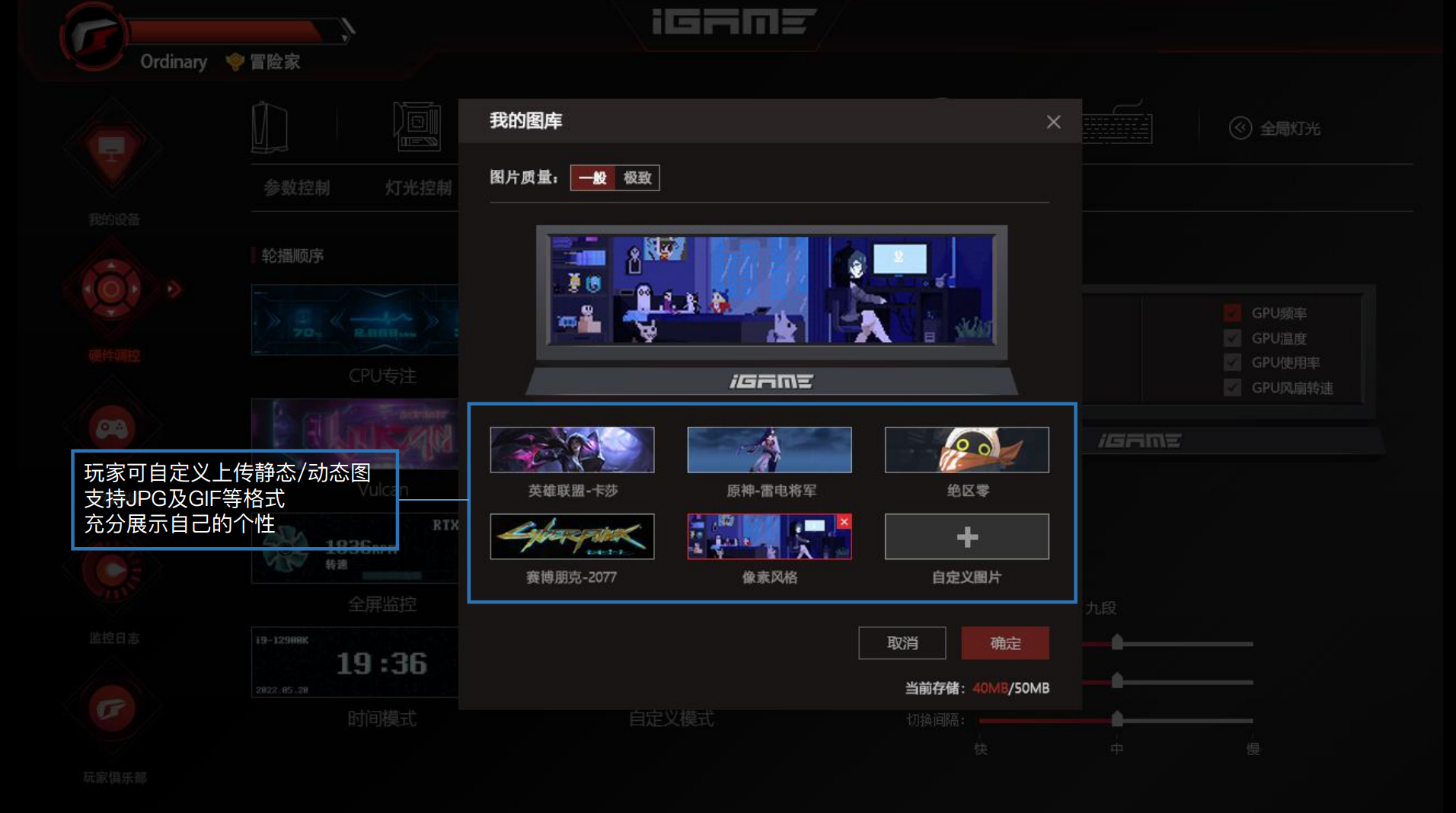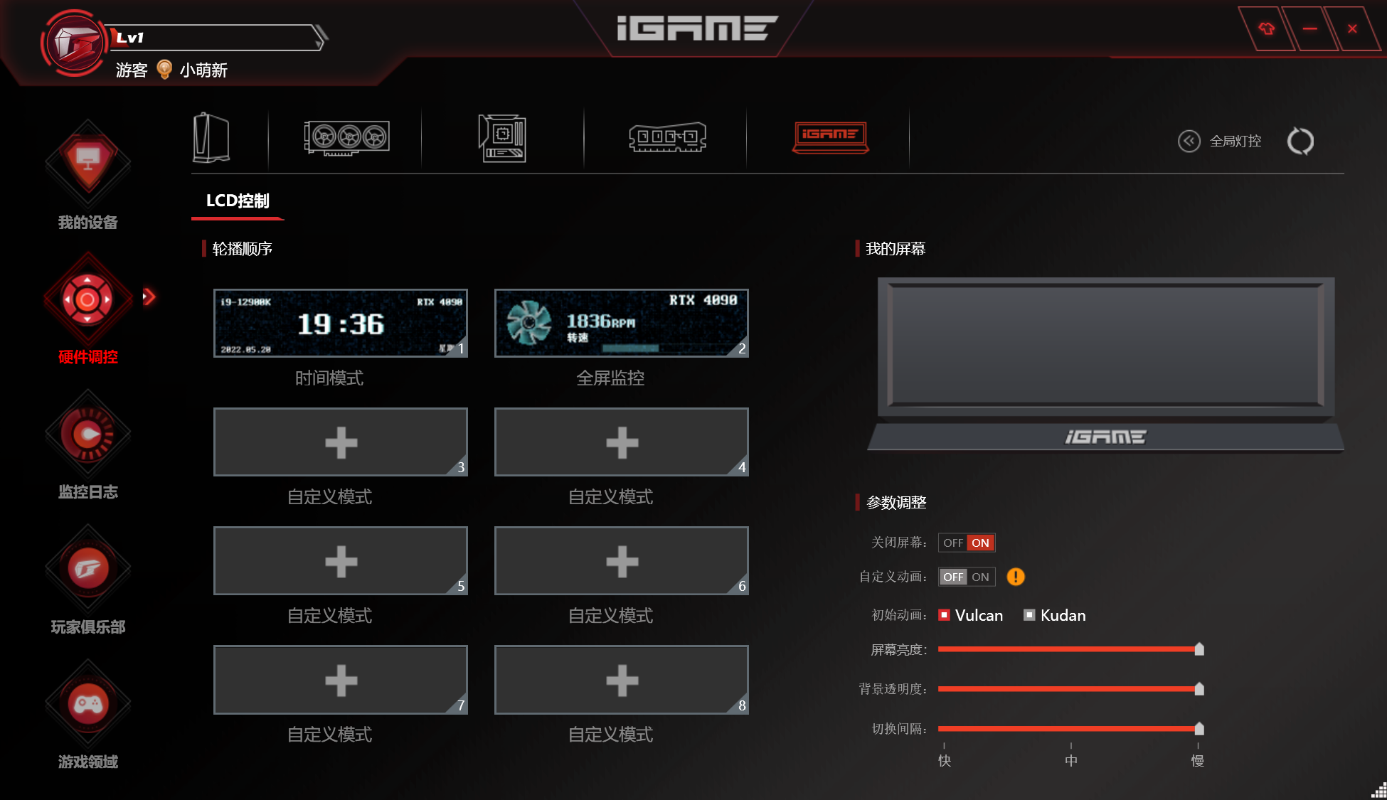 ▲通过全新的iGame Center软件,不仅可以调整硬件灯效,快捷的进行硬件超频,还可以为Vulcan系列显卡(包括之前几代Vulcan火神显卡)的LCD屏定制输出图案,且不只是静态图片,gif动图同样可以完美显示。