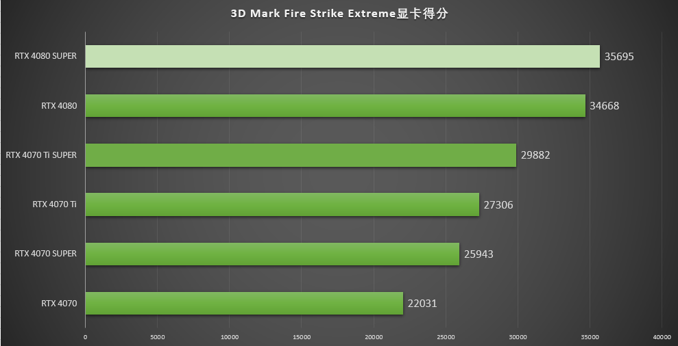 ▲在2K分辨率的Fire Strike Extreme 中,七彩虹iGame GeForce RTX 4080 SUPER Vulcan OC 的显卡得分为35695分,RTX 4080 得分34668的102.9%。