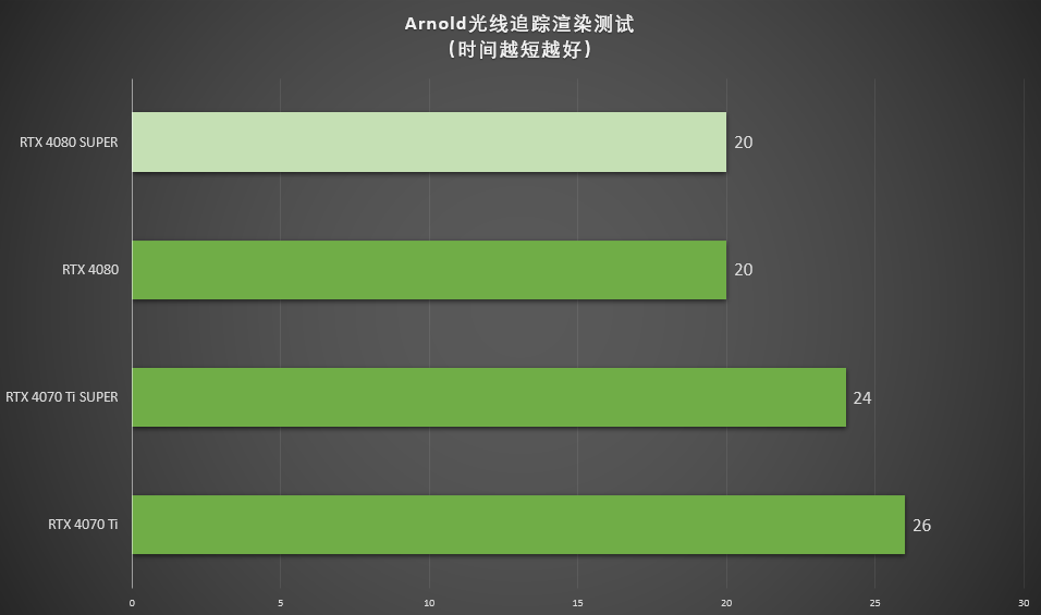 ▲本次的测试中,渲染时间越短,表现越优秀,七彩虹iGame GeForce RTX 4080 SUPER Vulcan OC渲染用时20秒,与RTX 4080 渲染时长相同。