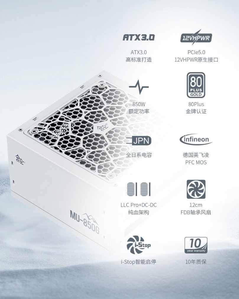 ▲另外,鑫谷昆仑MU-850G采用了LLC Pro+DC-DC的纯血架构,以非常优秀的成绩获得了80Plus金牌认证,并且还提供长达10年的质保。另外,这款电源还拥有支持i-Stop智能启停的12cm FDB轴承风扇,噪音控制也非常优秀。