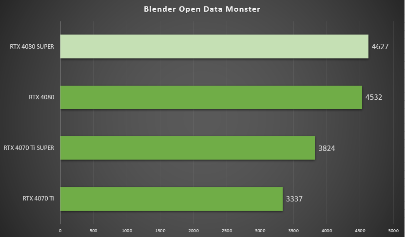 ▲在Blender Open Data Monster中,七彩虹iGame GeForce RTX 4080 SUPER Vulcan OC得分4627,是RTX 4080 得分962的102.1%。