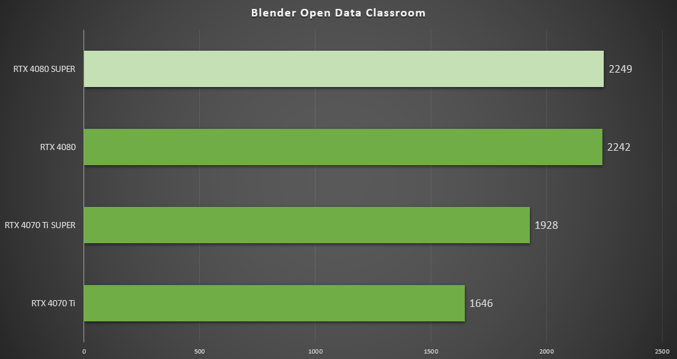 ▲在Blender Open Data Classroom中,七彩虹iGame GeForce RTX 4080 SUPER Vulcan OC得分2249,与RTX 4080 得分2242相差无几。