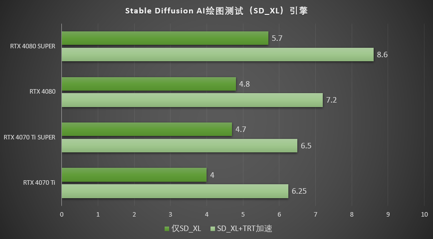 而不开启TRT加速时, RTX 4080 SUPER的AIGC速度是RTX 4080的110.1%。