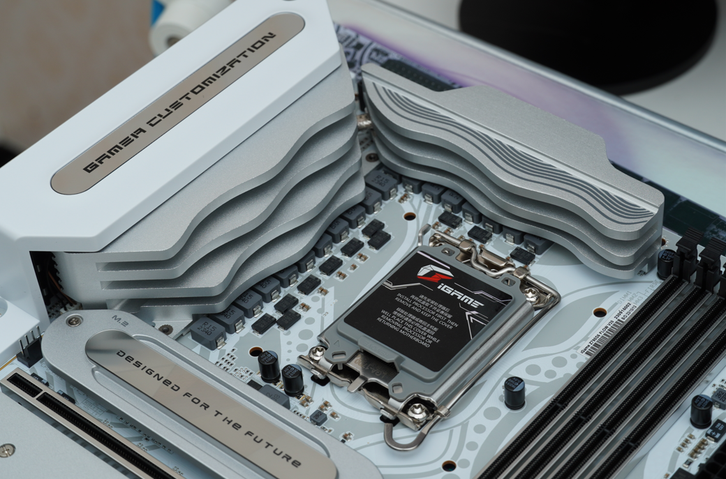 ▲看一个主板的做工和用料,首先肯定是要看它的供电部分,稳定的供电是所有的硬件稳定运行的保证,在CPU的供电上,iGame Z790D5 FLOW采用的是18+1+1相90ADr.MOS供电设计,配合着双8PIN的CPU供电接口,电力充足,即使作为i9-14900K的座驾也丝毫不虚。