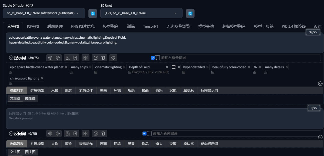 ▲我们首先使用SDXL Turbo模型并提供Tensor RT加速,测试的提示词为:epic space battle over a water planet, many ships, cinematic lighting, Depth of Field, hyper-detailed, beautifully color-coded, 8k, many details, chiaroscuro lighting。