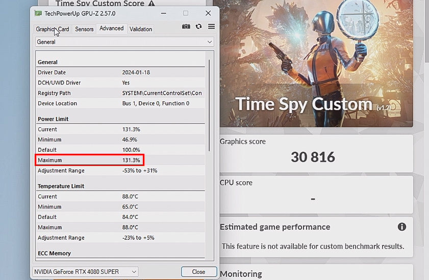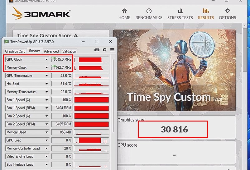ROG STRIX RTX 4080 SUPER OC优秀的散热表现,同样为玩家挖掘显卡的性能潜力打下了基础。接下来我们对显卡进行了超频测试,这款显卡的功率墙最高可以拉到131%。我们在解锁功率墙的基础上,成功的将显卡的GPU频率和显存频率超频了200MHz,游戏频率轻松突破3000MHz,达到3045MHz,在TimeSpy GPU测试中分数达到了30816,提升了大约4%。