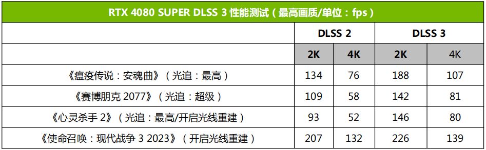 DLSS 3是RTX 40系列的重头戏,目前也有很多游戏大作都添加了对DLSS 3的支持,这次我们也选择了几款游戏进行测试。可以看到,RTX 4080 SUPER不管在2K分辨率还是4K分辨下,在采用同样的画质设定时,开启DLSS 3后的游戏帧率能在DLSS 2的基础上平均再高出34%,其中提升最大的《心灵杀手2》,开启DLSS 3的帧率比DLSS 2高了57%。帧率方面,在DLSS 3的加持下,《赛博朋克2077》《心灵杀手2》的帧率都从60fps以下跃升到80fps以上的流畅帧率,帧率提升效果相当明显,可以说完全征服了4K光追游戏。