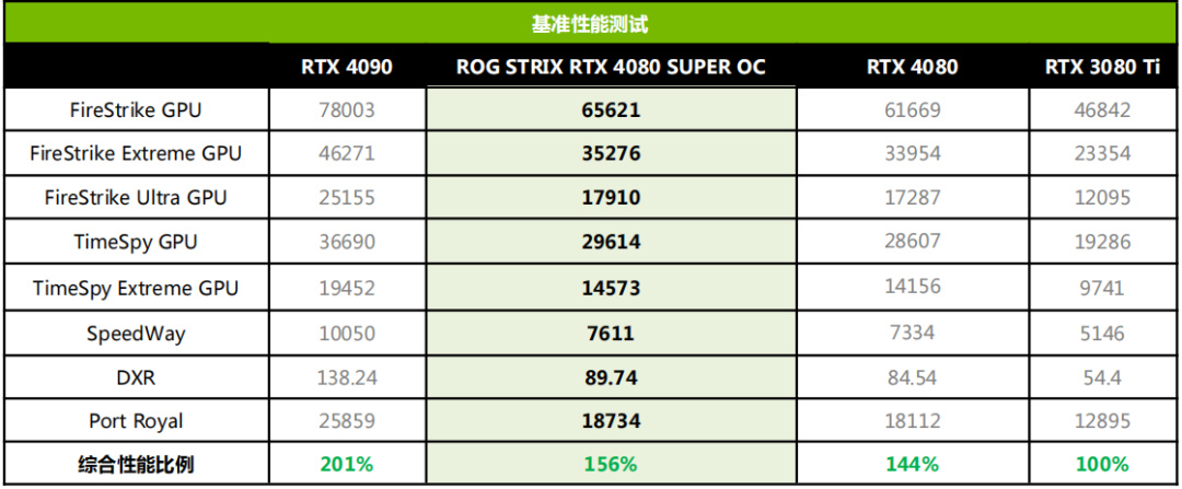 从3DMark GPU的基准性能测试部分来看,RTX 4080 SUPER在FireStrike和TimeSpy系列测试中,相比RTX 4080平均提升幅度约为4%,平均领先RXT 3080 Ti大约49%。在DX12U专属的SpeedWay测试中,同样高出RTX 4080约4%,领先RXT 3080 Ti大约48%。而在光追性能部分,RTX 4080 SUPER在DXR和Port Royal测试中分别高出RTX 4080大约6%和3%,平均领先RXT 3080 Ti大约55%。