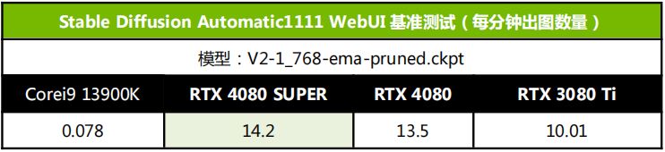 RTX 4080 SUPER具备16GB超大显存,算力也相当出色,非常适合用来完成Stable Diffusion本地出图任务。这里我们选用Stable Diffusion Automatic1111 WebUI来对RTX 4080 SUPER的出图效率进行测试。从测试成绩可以看到,RTX 4080 SUPER每分钟可以出图14.2张,是i9 13900K纯CPU方案的182倍以上,领先RTX 3080 Ti 大约42%,比RTX 4080提升了约5%。