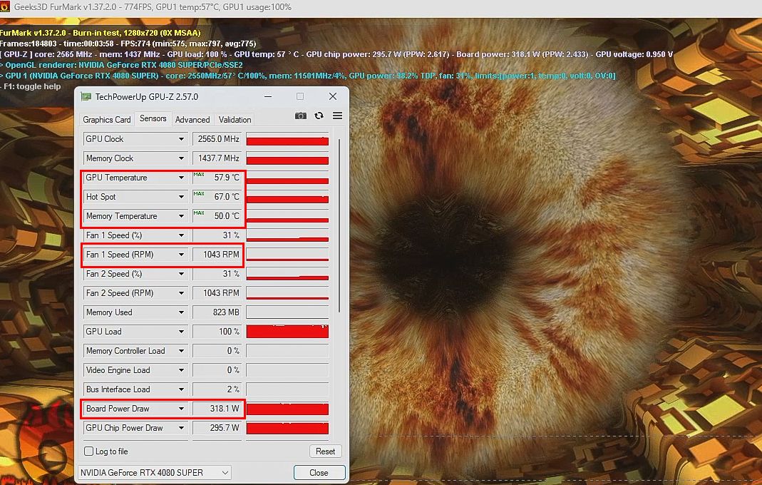 得益于ROG STRIX RTX 4080 SUPER OC强悍的散热配置,我们使用Furmark考机时,GPU温度最高仅有57℃,热点温度也只有67℃,显存温度为50℃,考机功率可以跑到318W,散热表现非常优秀。而在默认状态下考机,风扇转速只有1000rpm左右,静音表现也很出色,轻松压制住了RTX 4080 SUPER。
